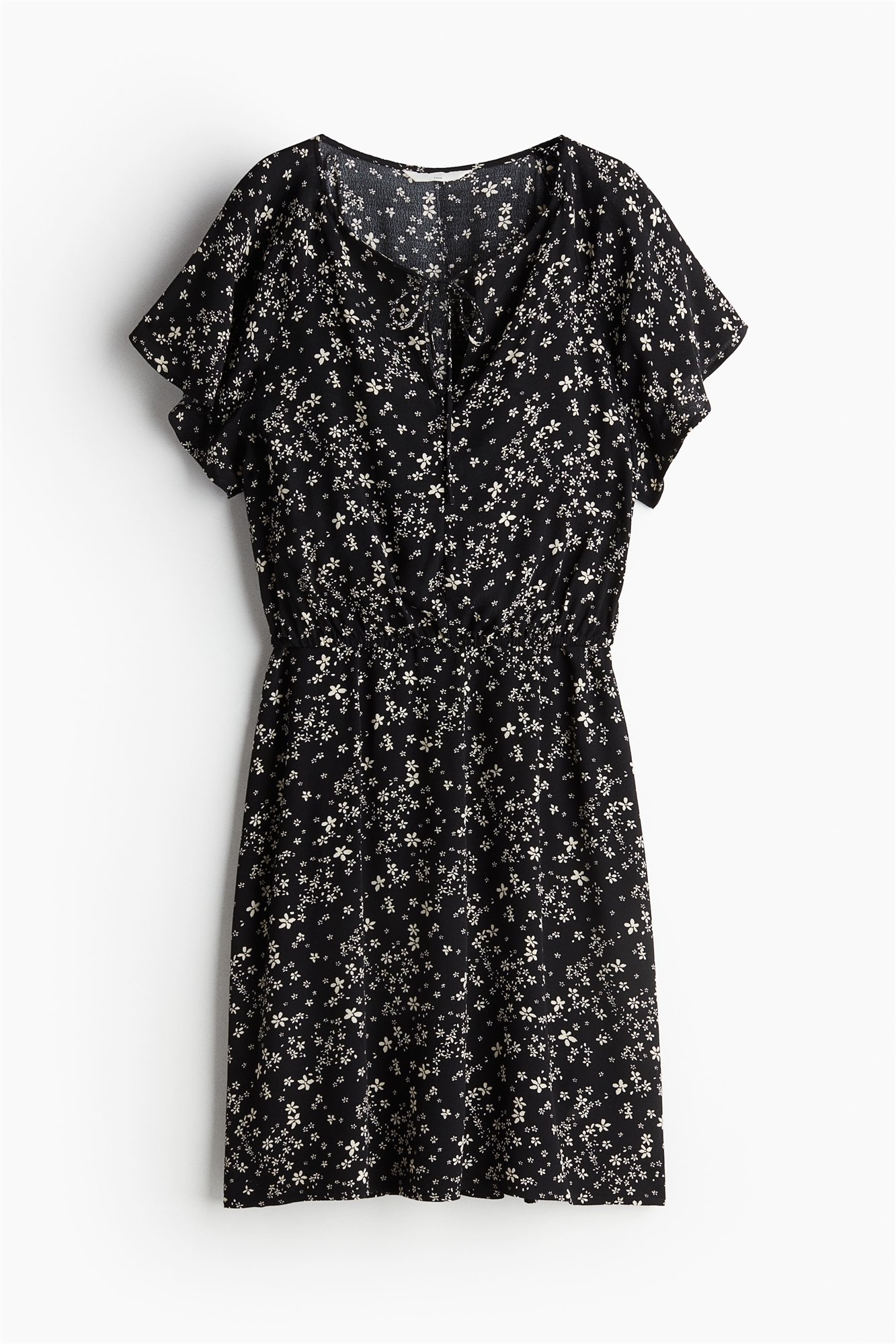 Платье для кормящих длиной до колена из вискозного полотна с уникальной особенностью для кормящих. Круглый вырез, V-образная пройма с узкими завязками спереди, рукава-бабочки и узкая, закрытая резинка на талии. Конструкция включает двойной слой в верхней части, чтобы помочь сохранить тепло и облегчить доступ к груди.