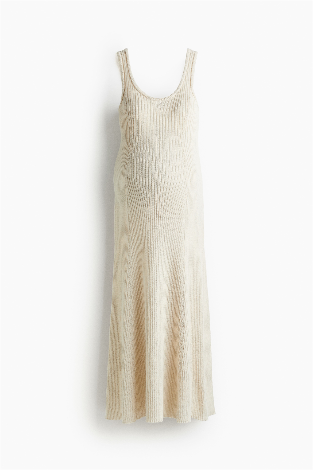 Платье длиной до щиколотки без рукавов из мягкого трикотажа в рубчик с круглым вырезом спереди и сзади. Слегка расширенные проймы и слегка расклешенная юбка.