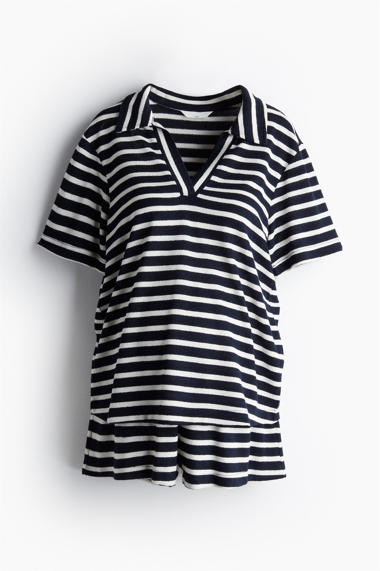 Комплект из топа и шорт из мягкого трикотажа. Топ с короткими рукавами, воротником и V-образной проймой спереди. Шорты с заниженной эластичной талией и незаметными боковыми карманами.