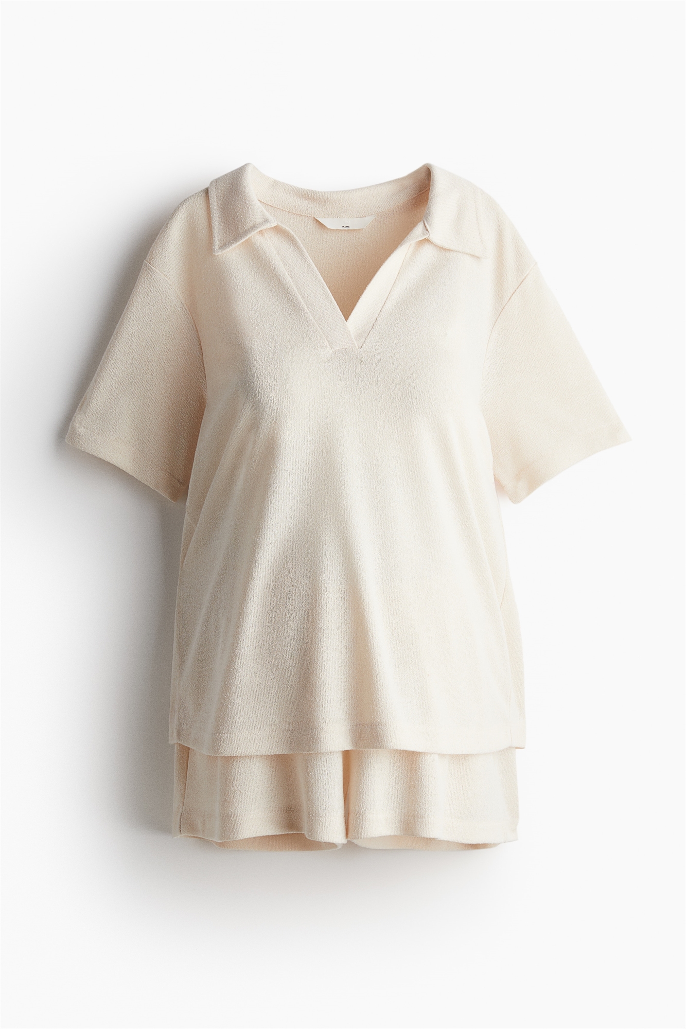 Комплект из топа и шорт из мягкого трикотажа. Топ с короткими рукавами, воротником и V-образной проймой спереди. Шорты с заниженной эластичной талией и незаметными боковыми карманами.
