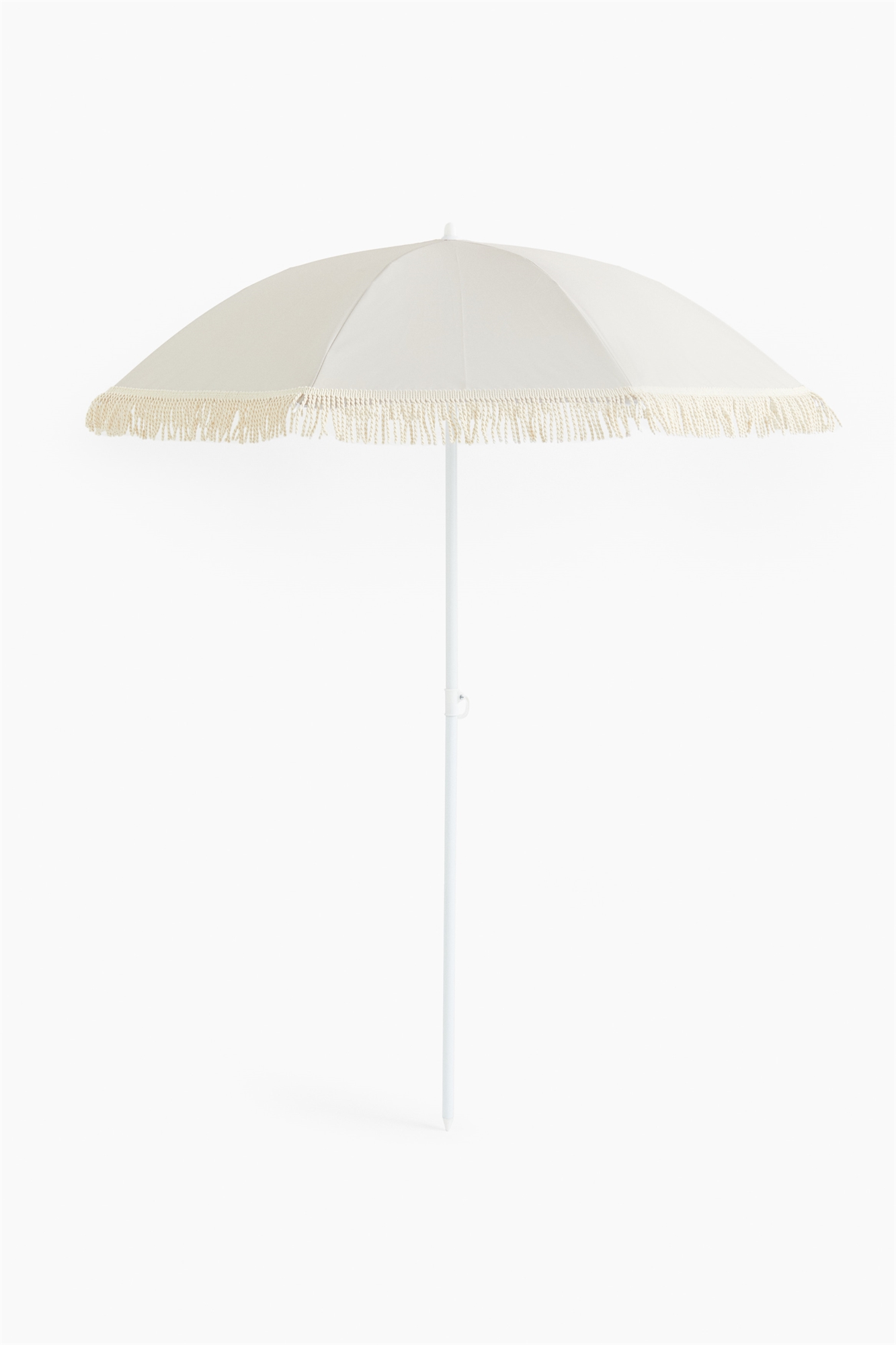 Зонтик с бахромой из устойчивой к ультрафиолетовому излучению ткани и пластикового стержня. Ремешок с крючками и петлями удерживает зонтик на месте, когда он не используется. Поставляется в комплекте с сумкой на шнурке. Диаметр 140 см.