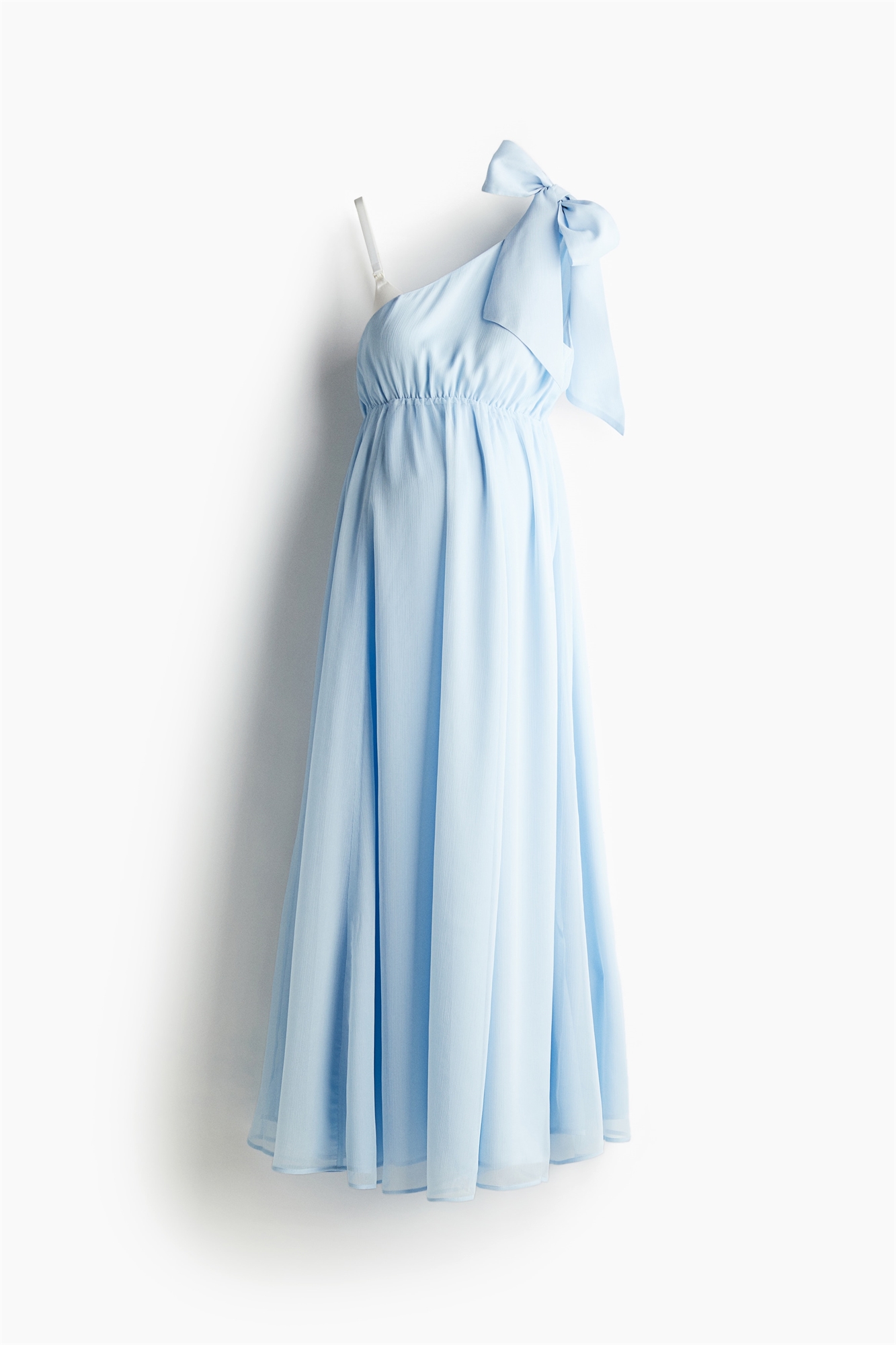 Платье длиной до колена из прозрачного крепа с асимметричным вырезом и широкой бретелью на одно плечо с завязками, которые завязываются на бант. Узкая эластичная резинка под бюстом и мягко расклешенная юбка. На подкладке.