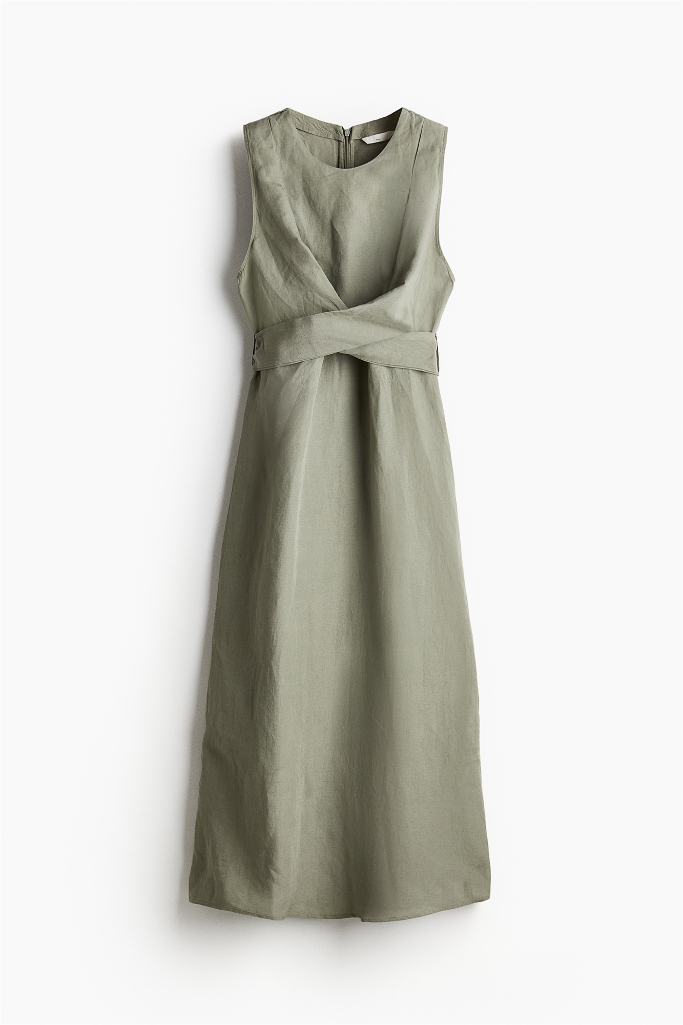 Платье для кормящих длиной до колен, без рукавов, из смеси льна и вискозы. Круглый вырез с потайной застежкой-молнией сзади и перекрещивающиеся детали спереди с завязками, которые завязываются и застегиваются сзади. Плиты с отверстиями для облегчения доступа к груди. На подкладке.