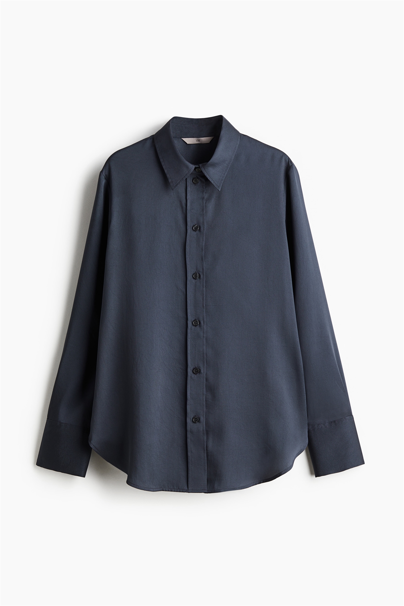 Рубашка из тканого материала с воротником и пуговицами спереди. Длинные рукава с манжетами на пуговицах и рукавной планкой с пуговицей. Закругленный подол.