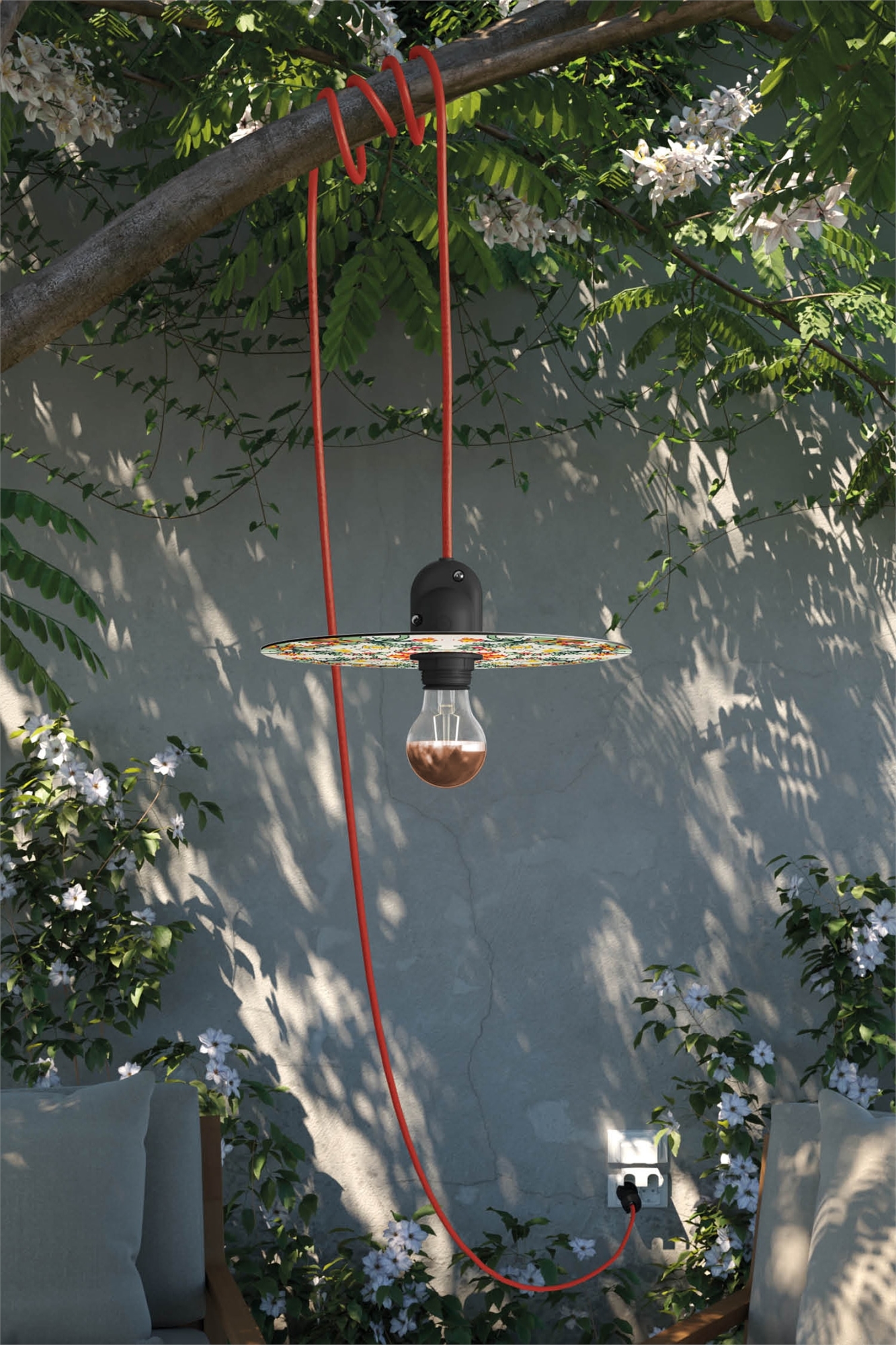 Переносной уличный светильник с абажуром из Dibond® с черно-белым рисунком майолики. Кабель с текстильным покрытием. Цоколь IP65 с разъемом E27. Вилка Schuko IP44. В комплект входит лампочка с отражающей головкой серебристого цвета 7 Вт, 806 Лм. Диаметр абажура: 24 см. Длина кабеля 5000 см.
