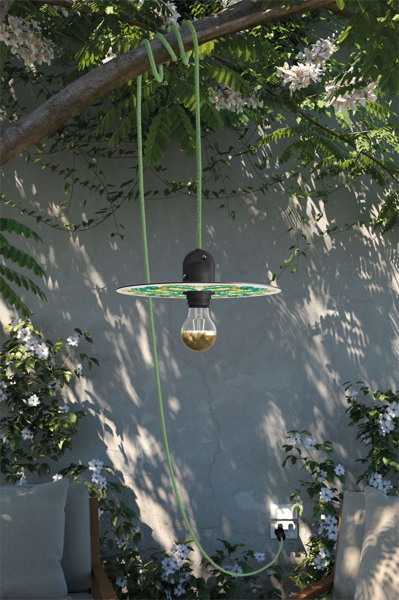 Переносной уличный светильник с абажуром из Dibond® с черно-белым рисунком майолики. Кабель с текстильным покрытием. Цоколь IP65 с разъемом E27. Вилка Schuko IP44. В комплект входит лампочка с отражающей головкой серебристого цвета 7 Вт, 806 Лм. Диаметр абажура: 24 см. Длина кабеля 5000 см.
