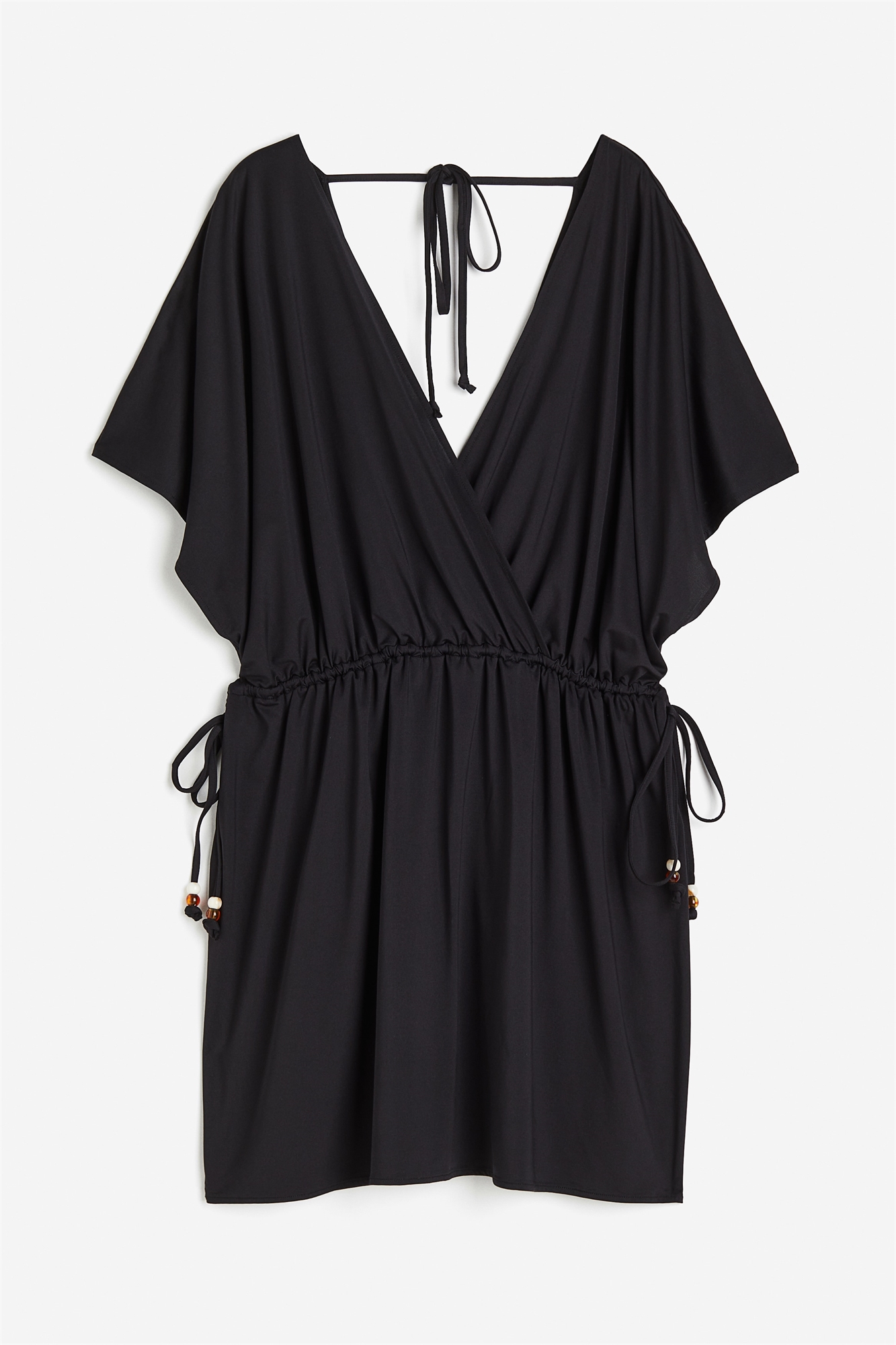 Короткое пляжное платье свободного покроя из джерси-стрейч. Глубокий V-образный вырез спереди и сзади с небольшим заворотом и узкими завязками сзади на шее. Короткие рукава и узкие завязки на талии, которые завязываются по бокам.