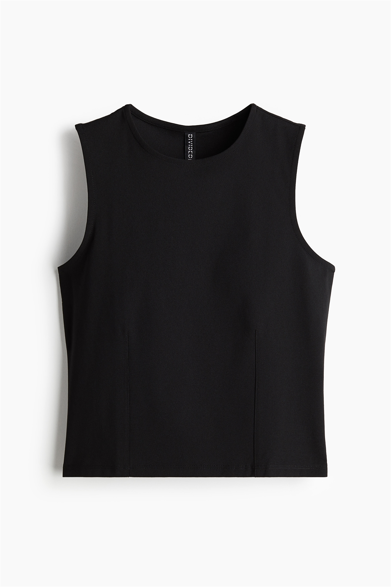 Короткий приталенный жилет из плотного трикотажа с талиевыми вытачками для создания четкого силуэта.