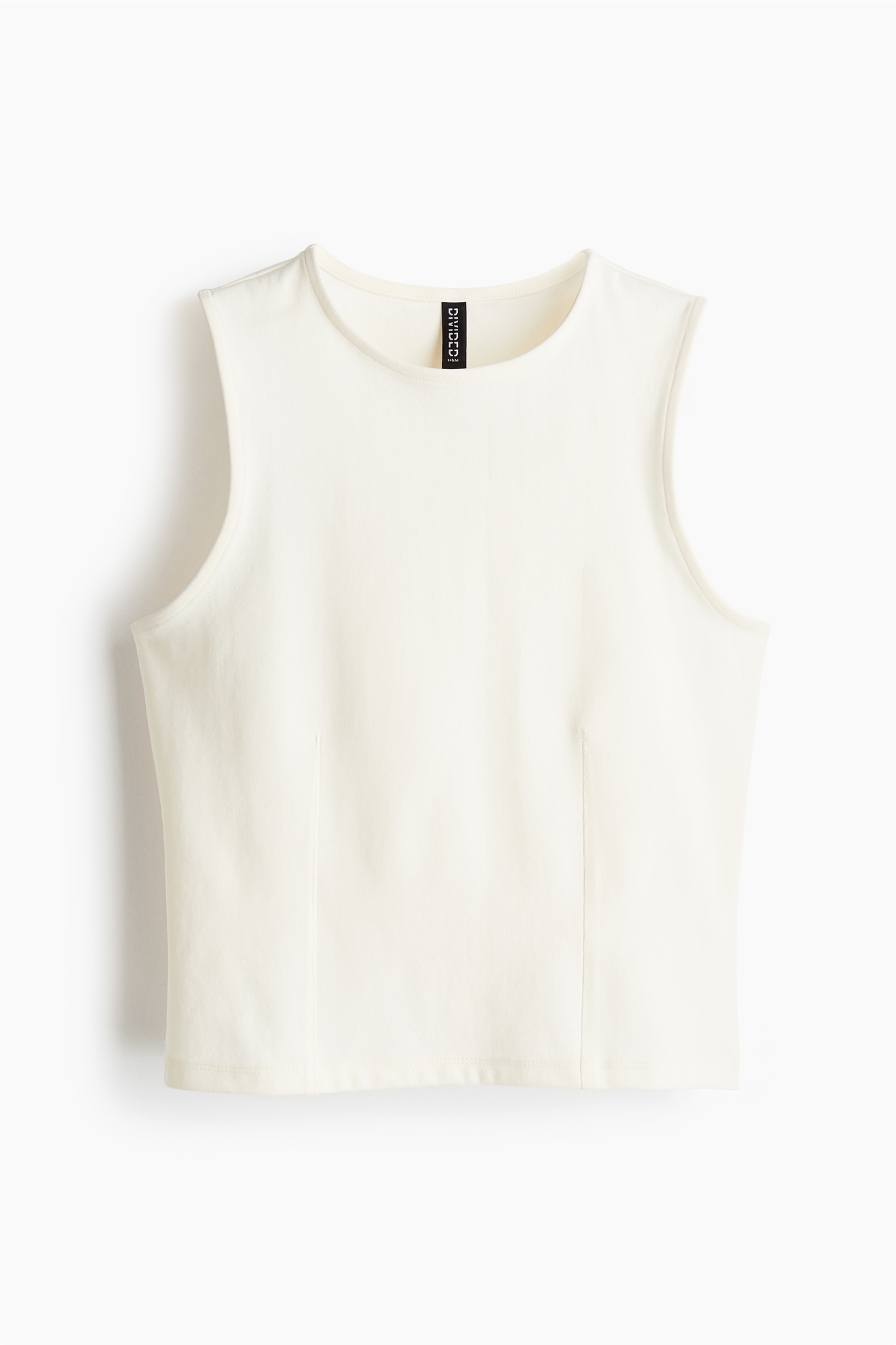 Короткий приталенный жилет из плотного трикотажа с талиевыми вытачками для создания четкого силуэта.