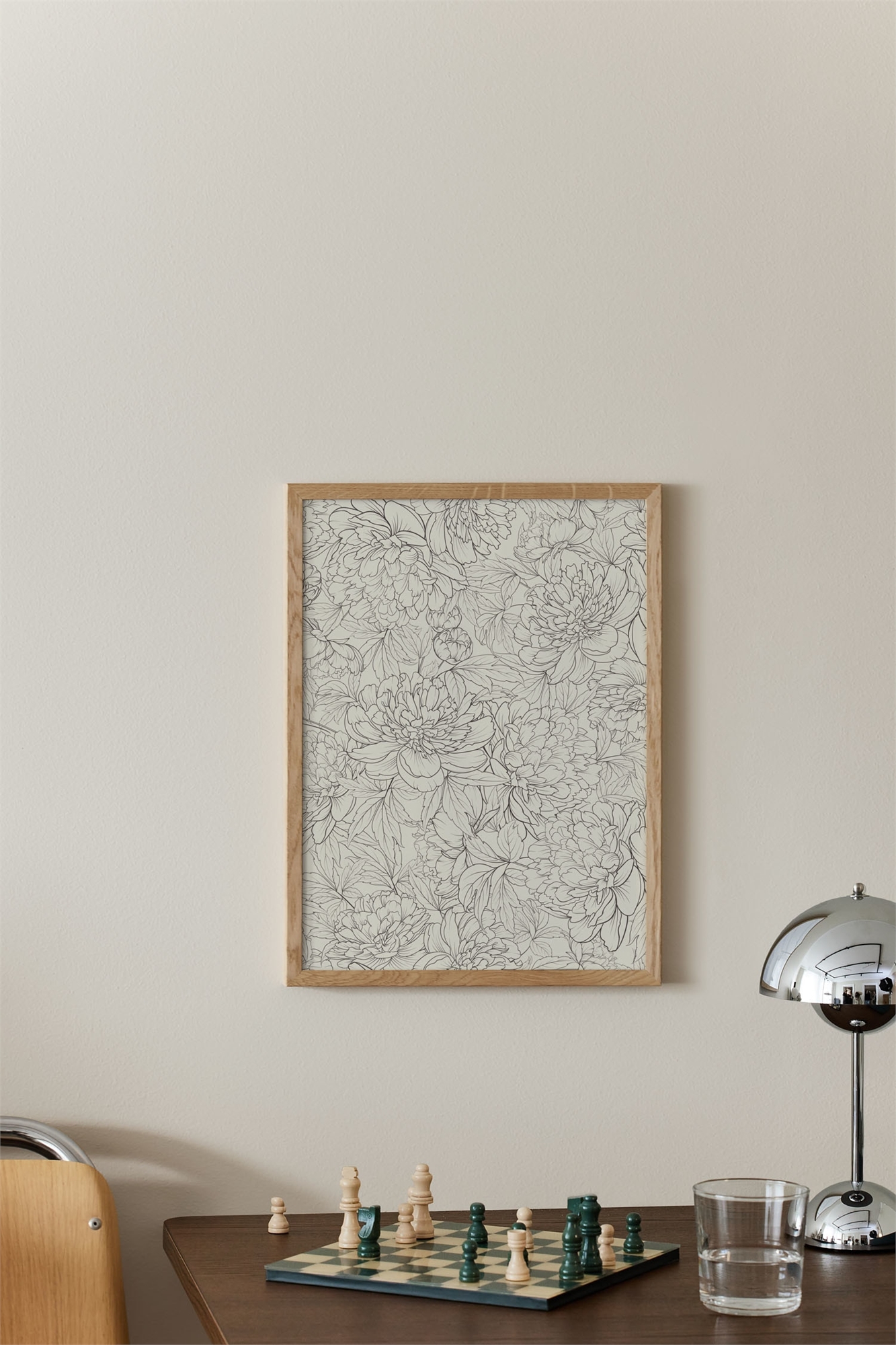 Графический мотив, изображающий пионы на бежевом фоне.
