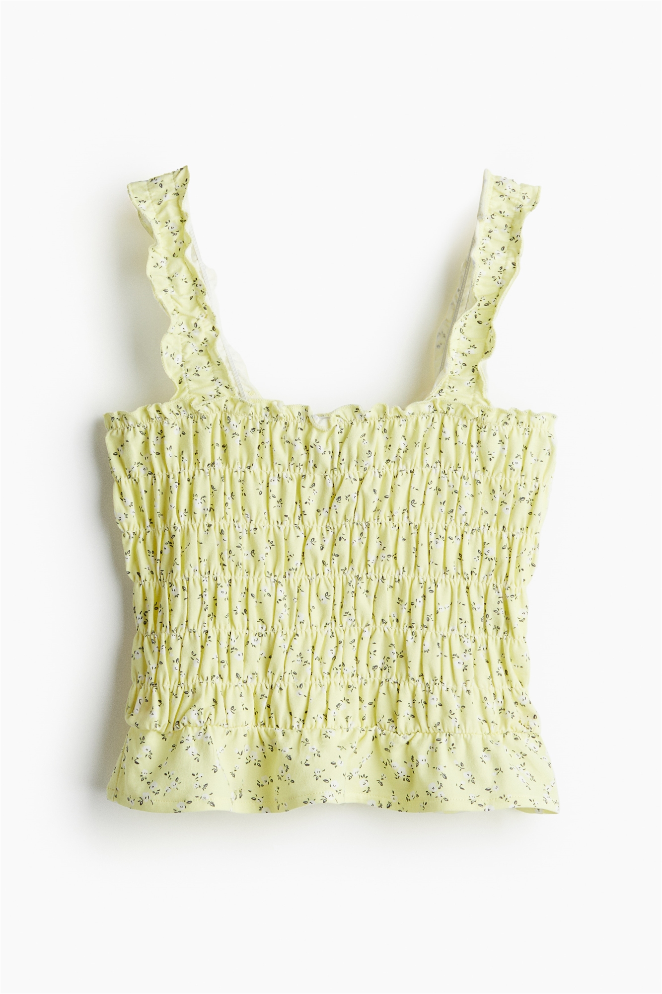 Приталенный топ из плавленого трикотажа с квадратным вырезом и широкими эластичными бретелями с маленькими оборками. Маленькая оборка в верхней части и широкая оборка по подолу.