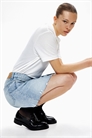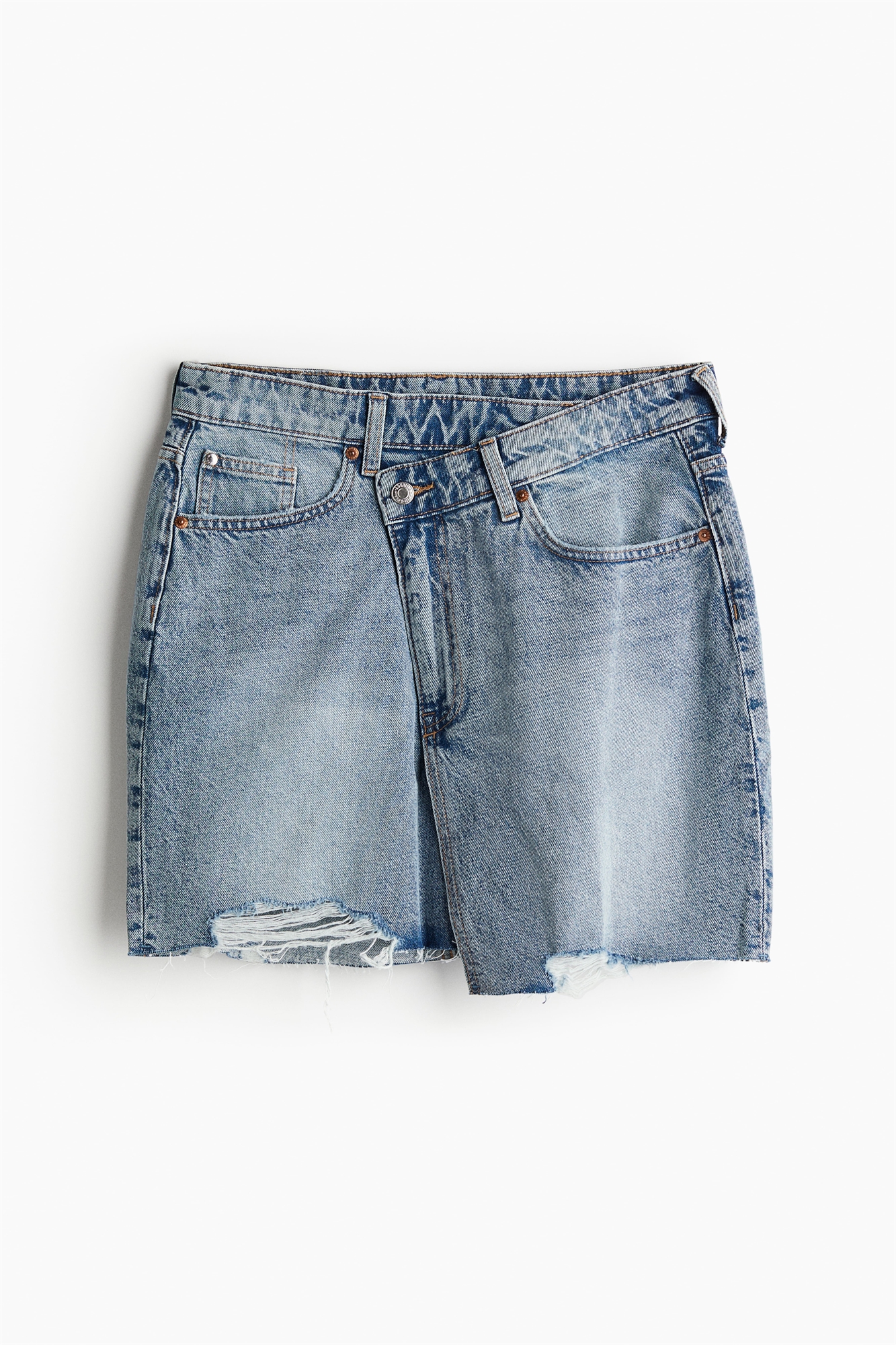 Короткая юбка с 5 карманами из жесткого хлопкового денима с высокой талией, затягивающимся поясом и ширинкой на молнии с одной видимой и одной потайной пуговицей. Необработанный подол.