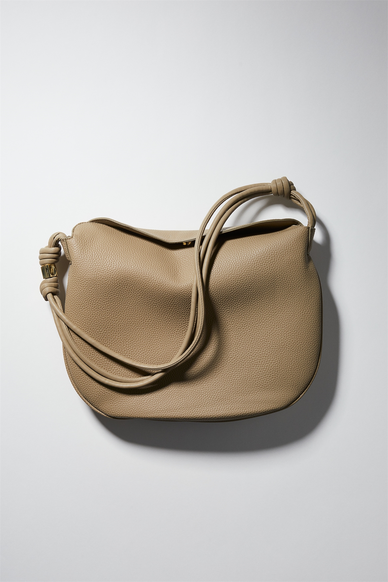 Сумка через плечо из зернистой ткани с покрытием, скрытой магнитной застежкой, открытым внутренним отделением и трехсекционным плечевым ремнем с узлами и металлической деталью на одном конце. На подкладке. Глубина 7 см. Высота 25 см. Ширина 30 см.