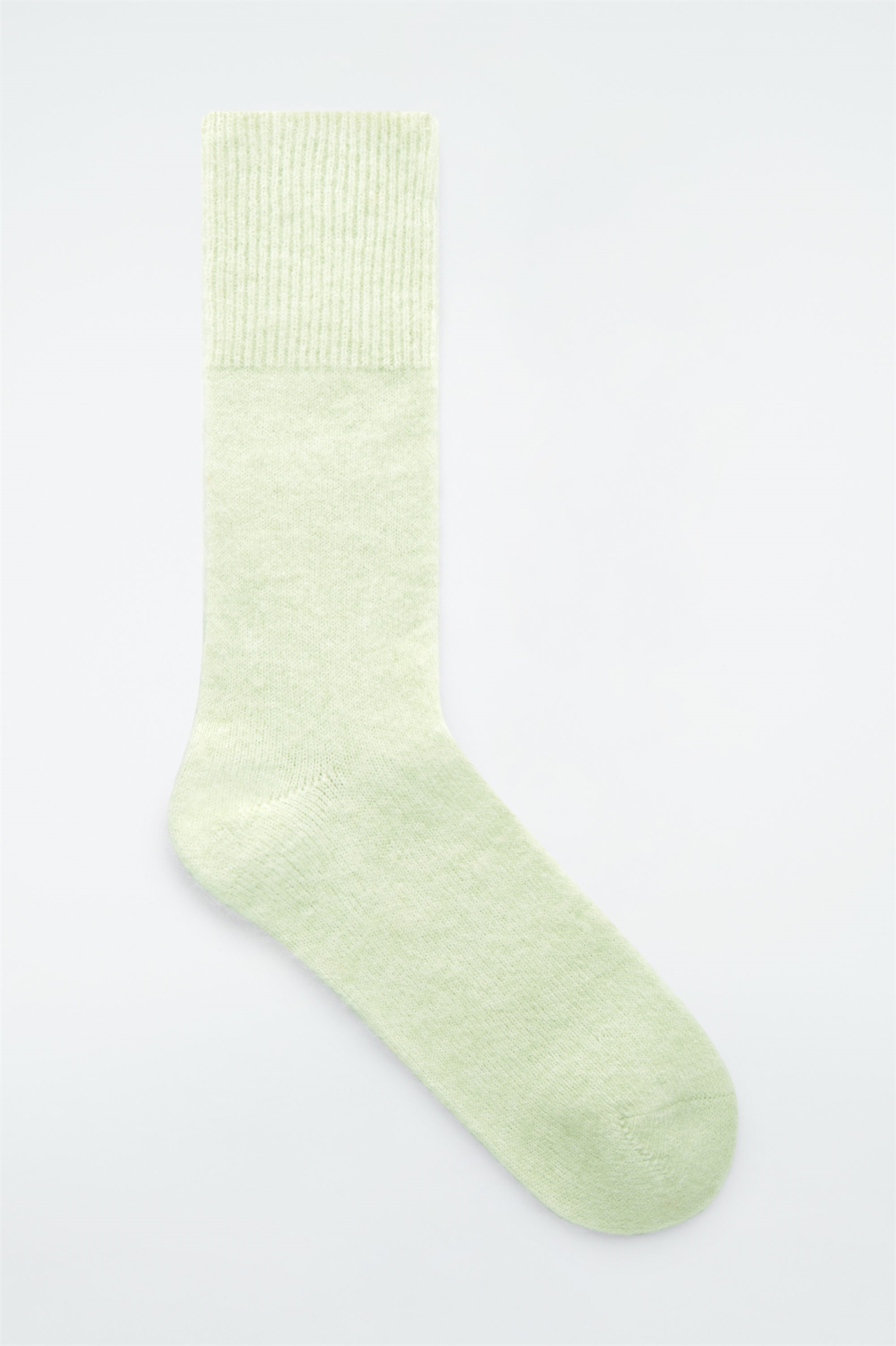 Когда температура падает, стоит позаботиться об уютных базовых вещах. Эти носки светло-шафранового оттенка связаны из мягкой шерсти и альпаки и имеют ребристые манжеты, которые не спадают в течение всего дня. Переработанный полиэстер, являющийся лучшей альтернативой обычному полиэстеру, изготавливается из отходов, полученных до и после утилизации отходов Шелл: 35% переработанного полиэстера, 31% альпака, 31% шерсти RWS, 3% эластана. Без учета отделки / Машинная стирка