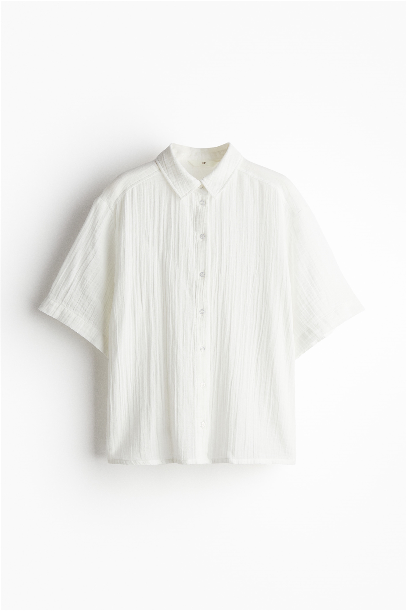 Рубашка из мягкого хлопкового муслина с воротником, пуговицами спереди и ярмом с коробчатой складкой сзади. Свободный крой с опущенными плечами и широкими рукавами длиной до локтя.