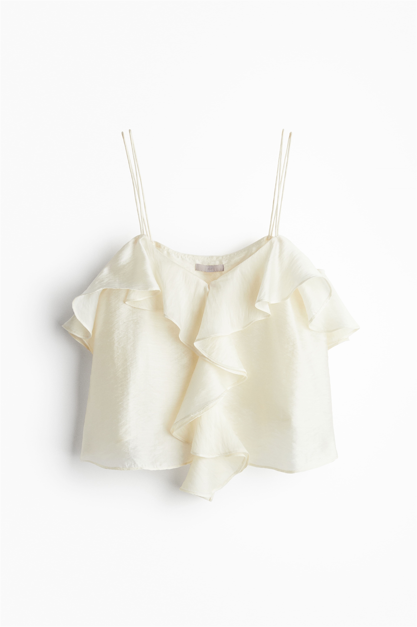 Короткий приталенный топ из тканого материала из смеси лиоцелла. V-образный вырез спереди, двойные бретели-спагетти и воланы вокруг верха и спереди.