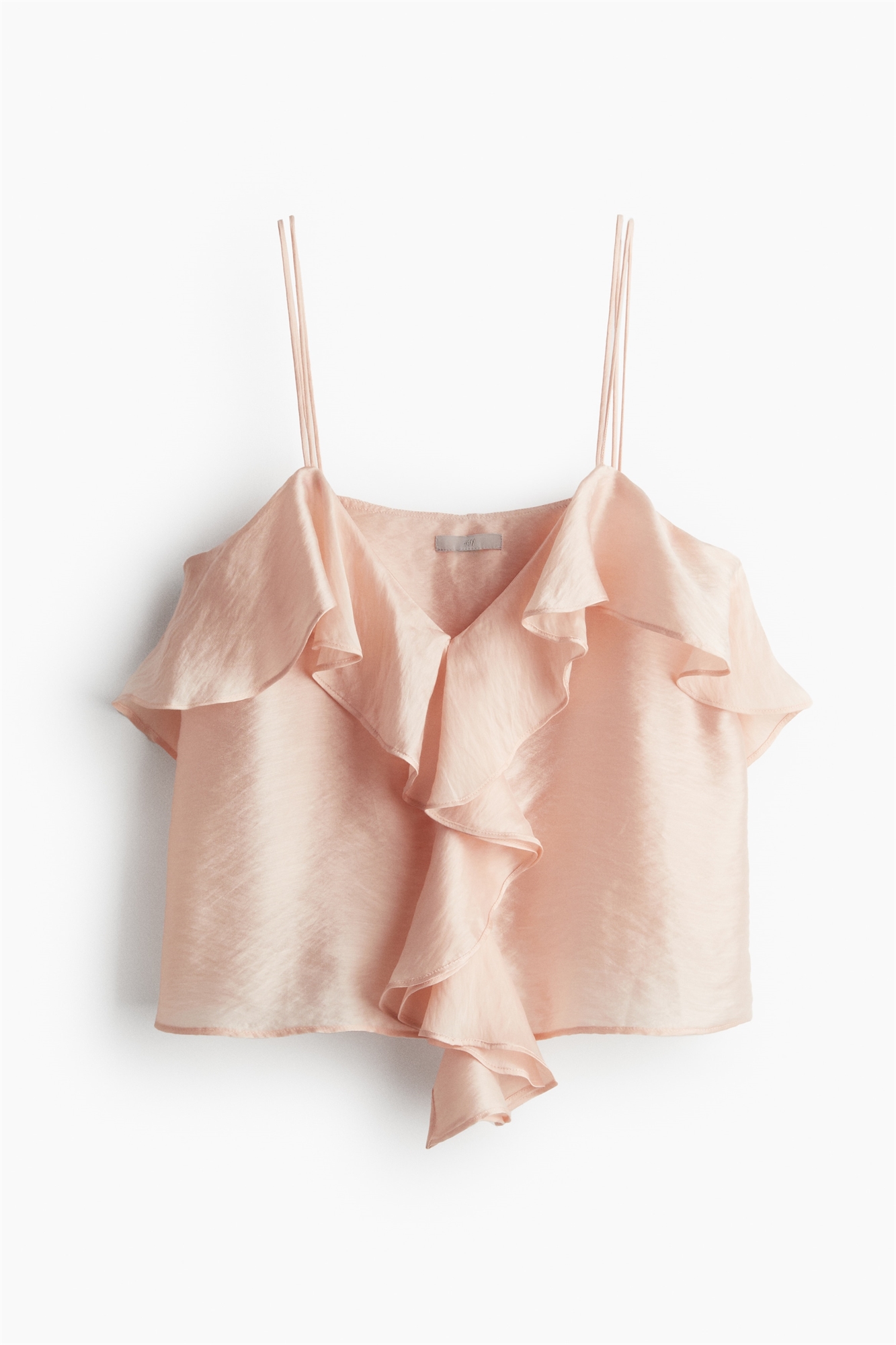 Короткий приталенный топ из тканого материала из смеси лиоцелла. V-образный вырез спереди, двойные бретели-спагетти и воланы вокруг верха и спереди.