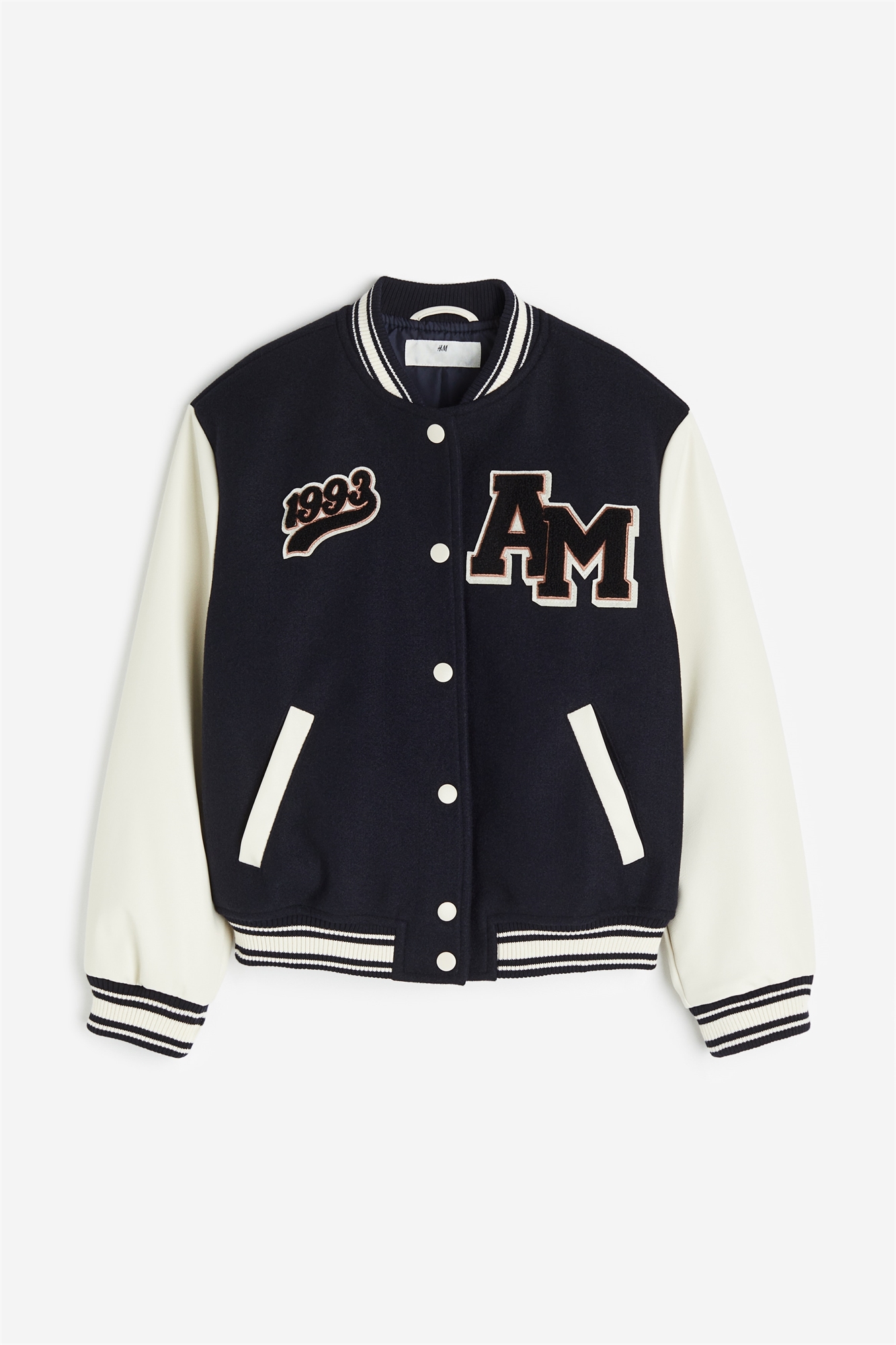 Бейсбольная куртка из мягкой войлочной ткани с вышитыми аппликациями и рукавами из тканого материала с покрытием. Свободный крой. С отложным воротником, застежкой-шпилькой, накладными карманами, ребристыми манжетами и подолом. На подкладке.