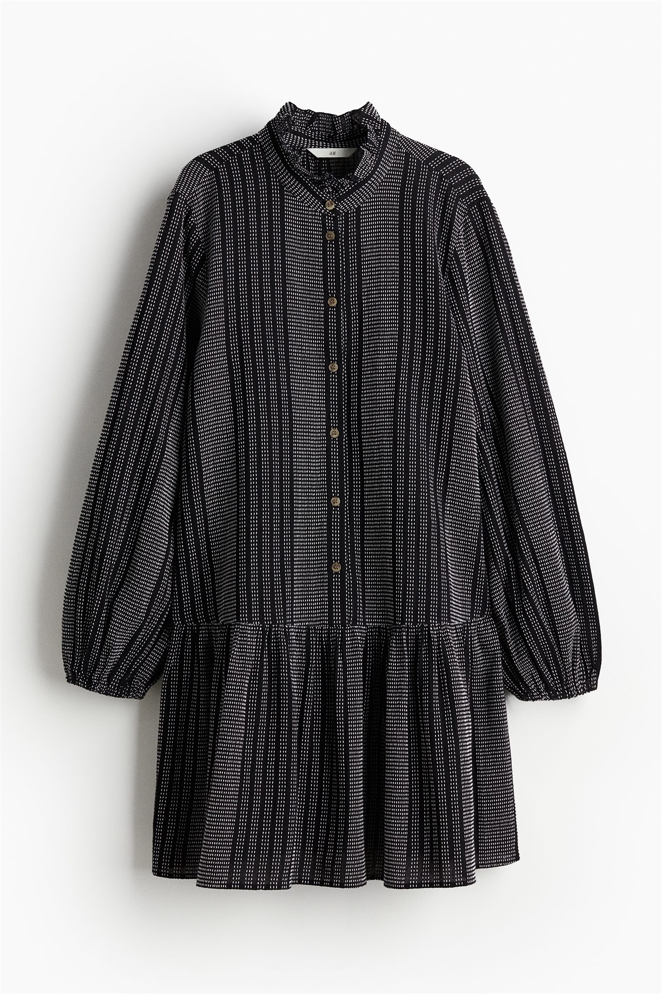 Короткое платье из тканого материала с воротником-бантом с оборкой и застежкой на пуговицы спереди. Свободный крой с мягко опущенными плечами, длинными рукавами-баллончиками с эластичными манжетами и сборкой по шву на бедрах.