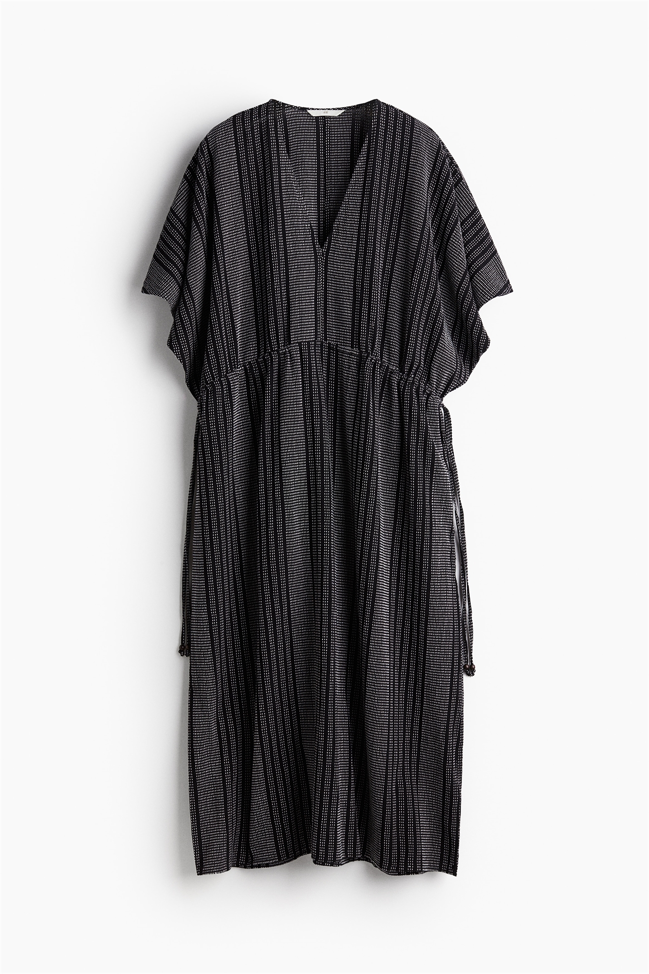 Платье-кафтан длиной до колен из тканого материала с V-образным вырезом и короткими широкими рукавами. Свободный крой с утягивающим шнурком на талии, который завязывается по бокам. Без подкладки.