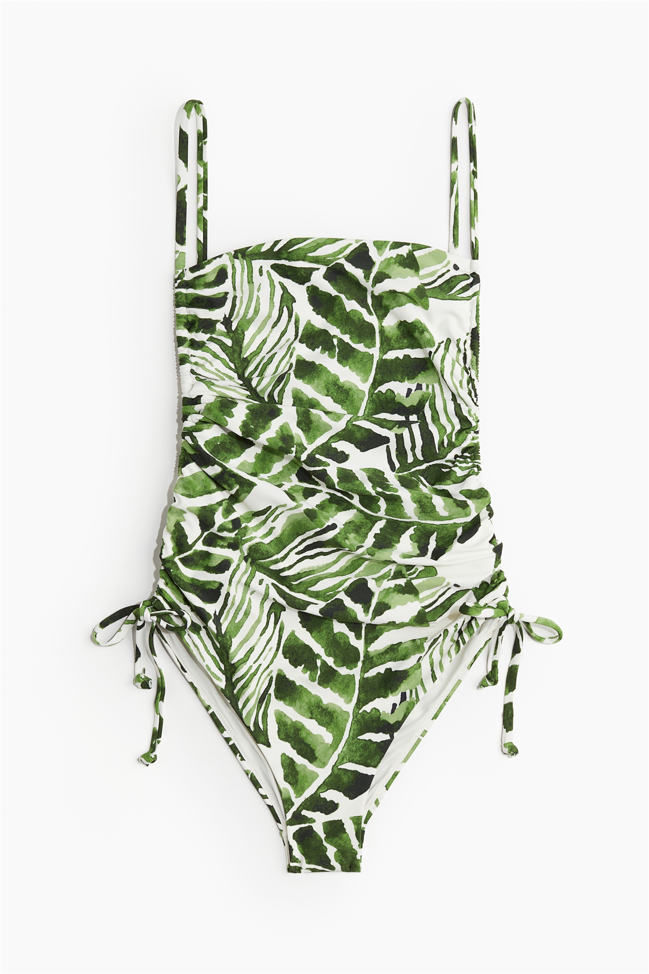 Полностью закрытый купальник с регулируемыми бретелями, прямым вырезом спереди и глубоким прямым вырезом сзади. Ноги с высоким вырезом и вырезом сзади. Завязки с каждой стороны для регулировки посадки.