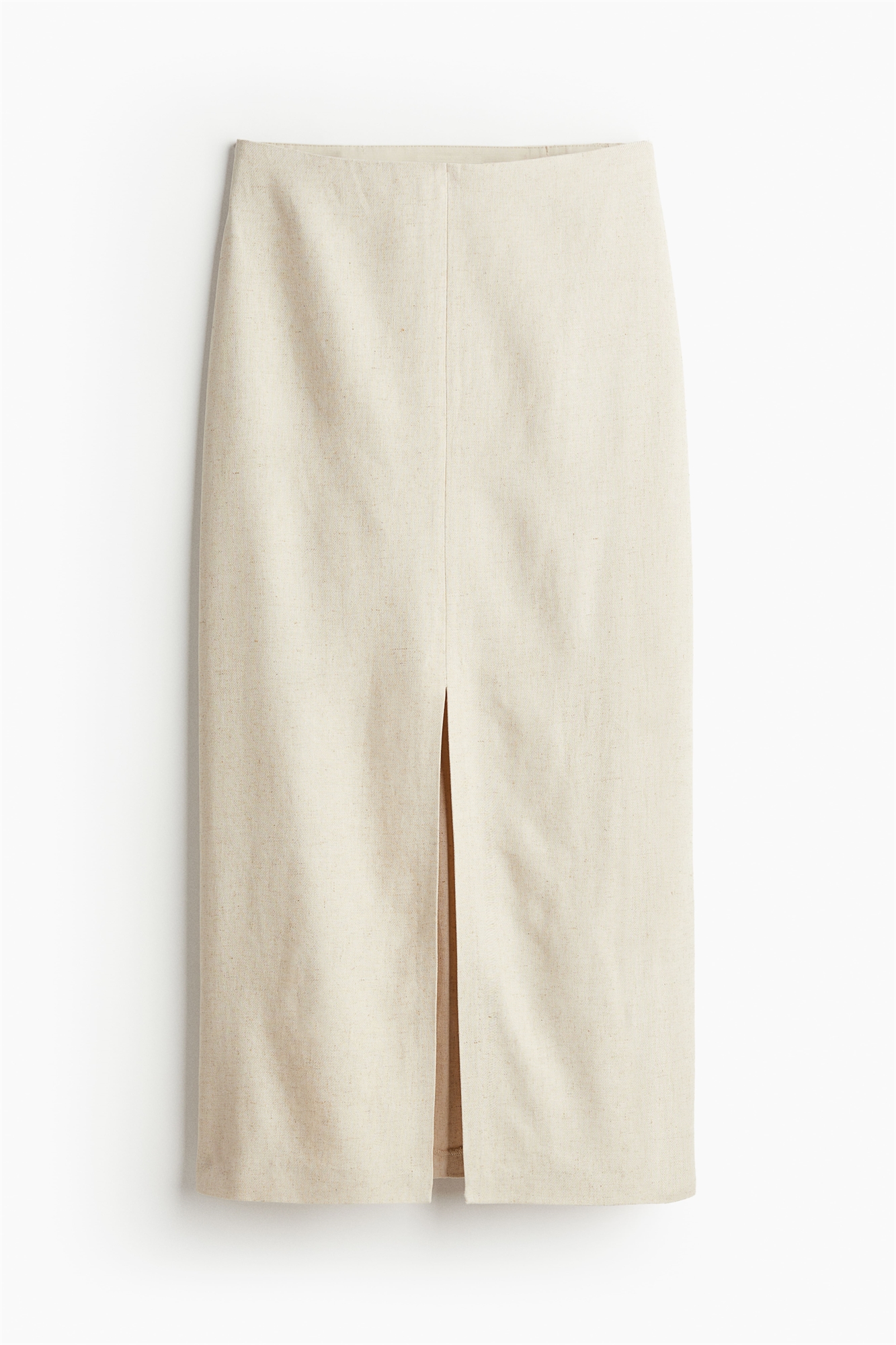 Приталенная юбка длиной до колен из тканого материала с заниженной талией и скрытой эластичной резинкой. Скрытая застежка на молнию и пуговицу с одной стороны и высокий разрез спереди. Без подкладки.