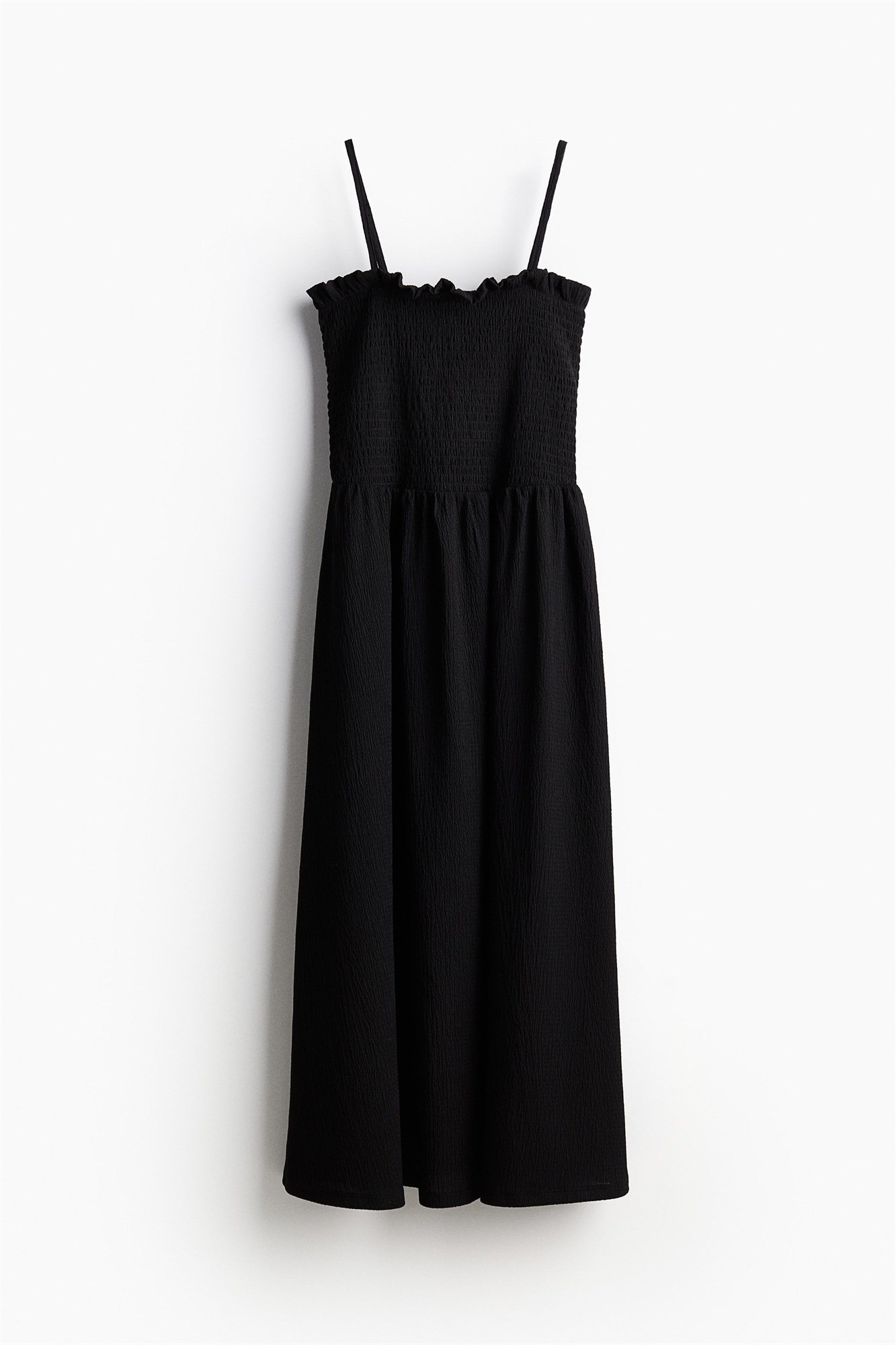 Платье длиной до колена без рукавов из фактурного джерси с узкими регулируемыми бретелями, лифом с отделкой оборками и расклешенной юбкой.
