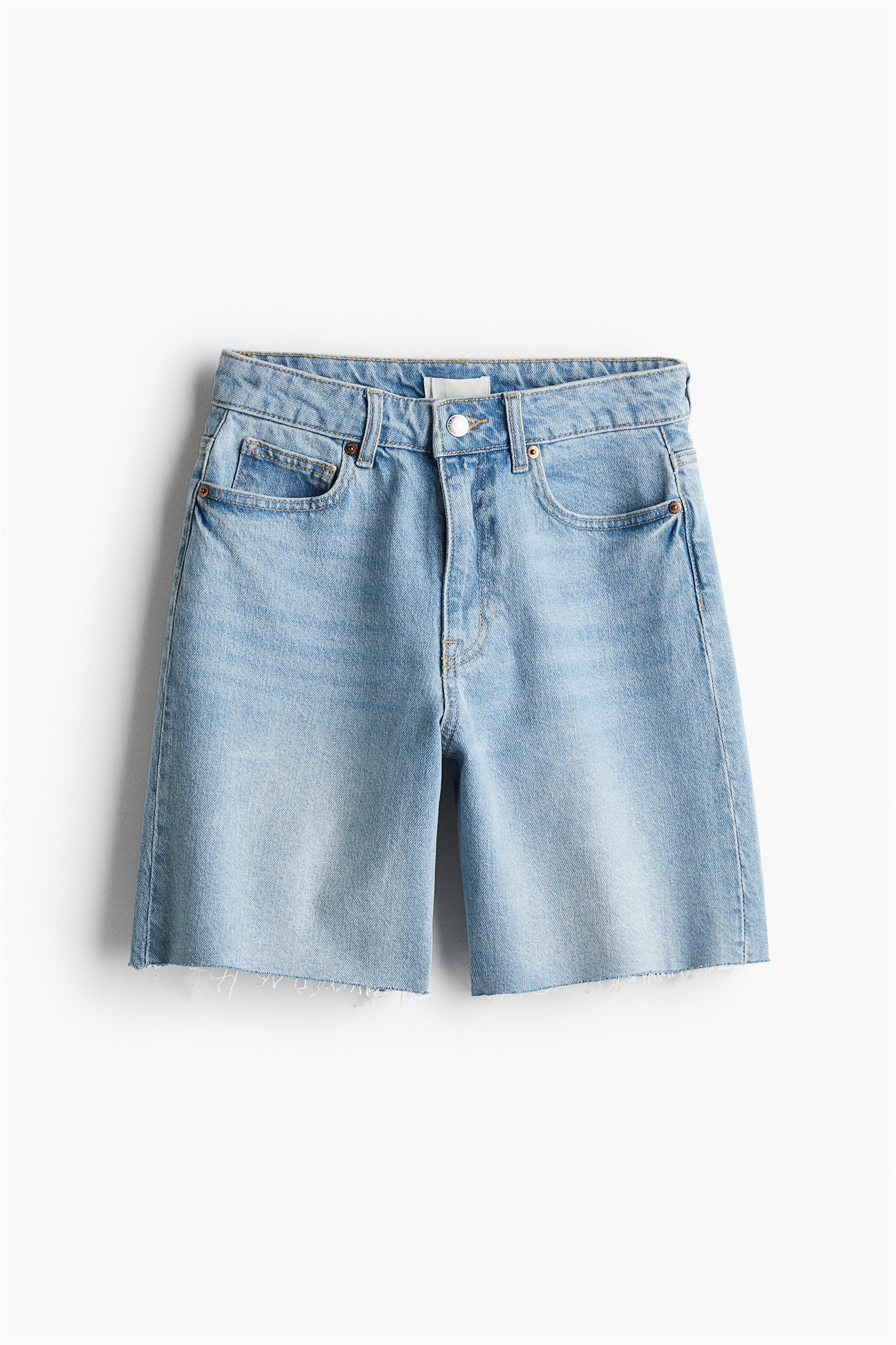 Шорты с 5 карманами из хлопкового денима с легким стретчем для комфорта. Высокая талия, ширинка на молнии и пуговице, длина до колена, необработанные края.