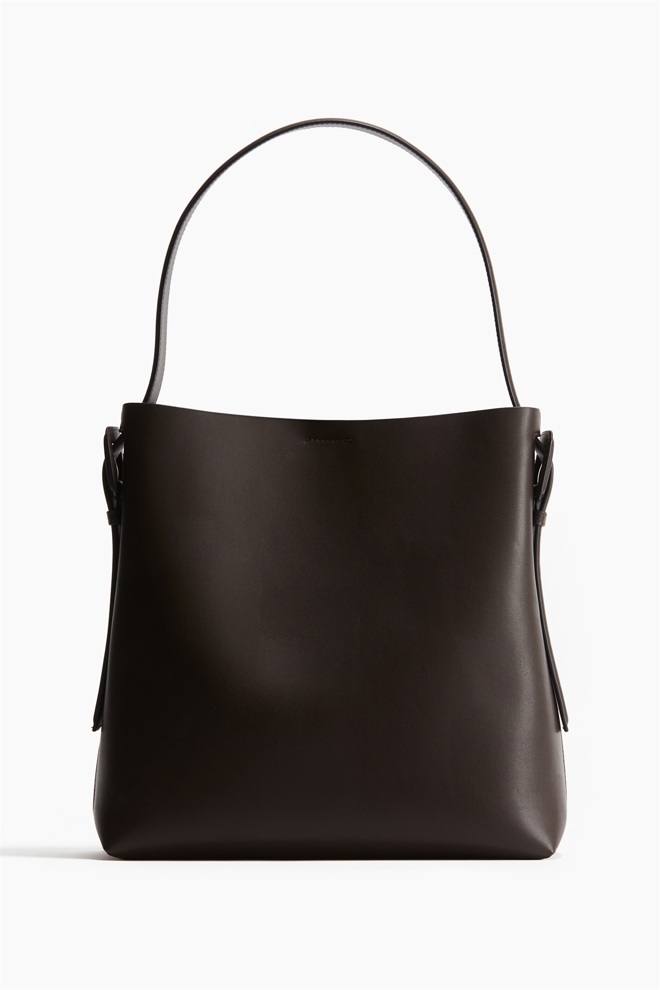 Сумка-шоппер из лакированной ткани с регулируемой ручкой с металлической застежкой на каждой стороне и скрытой магнитной застежкой. На подкладке.