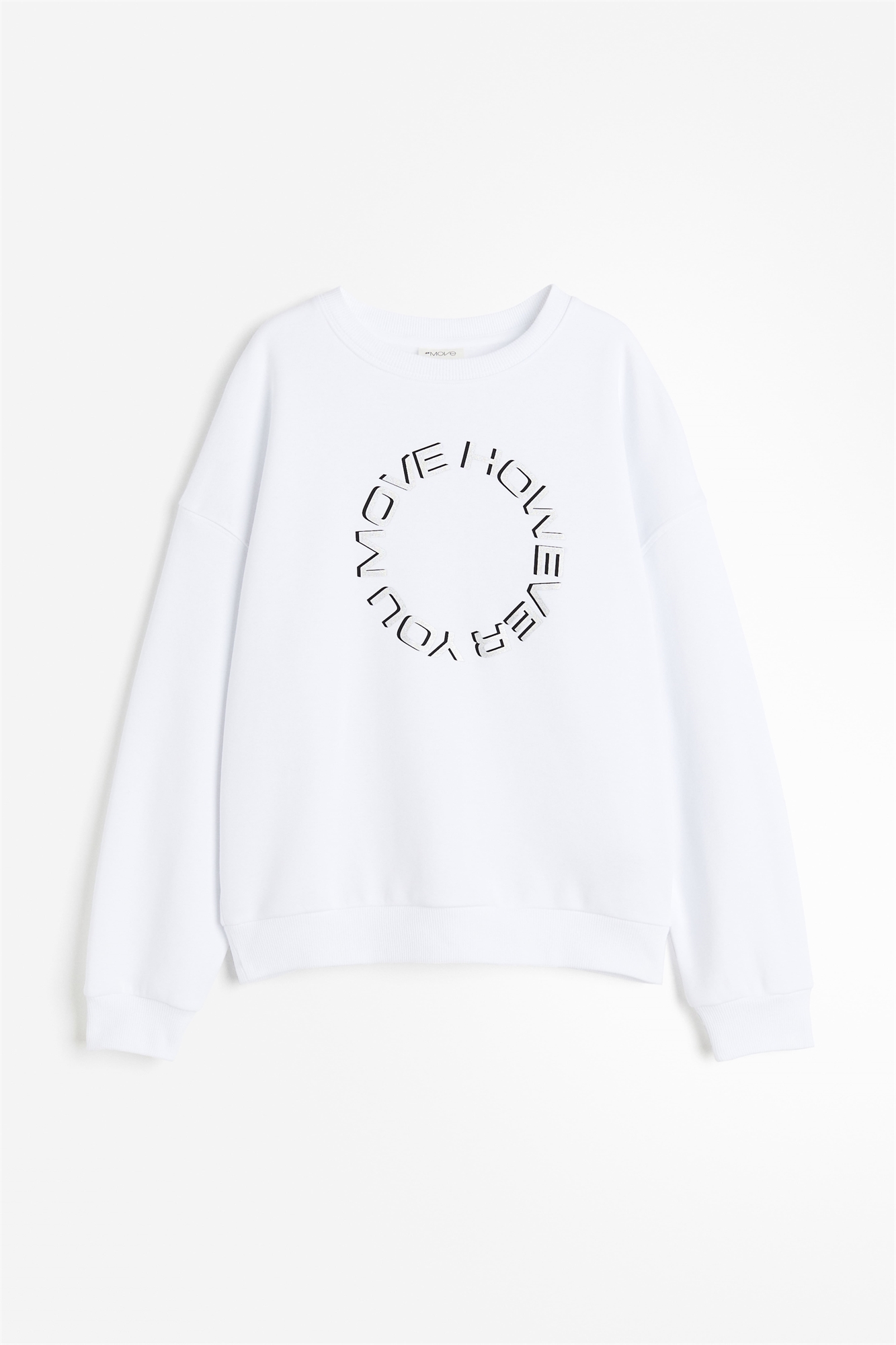 Спортивный топ из толстовочной ткани с принтом спереди и мягким начесом внутри. Свободный крой с круглым вырезом, спущенными плечами и длинными рукавами. Окантовка по вырезу горловины, манжетам и подолу.