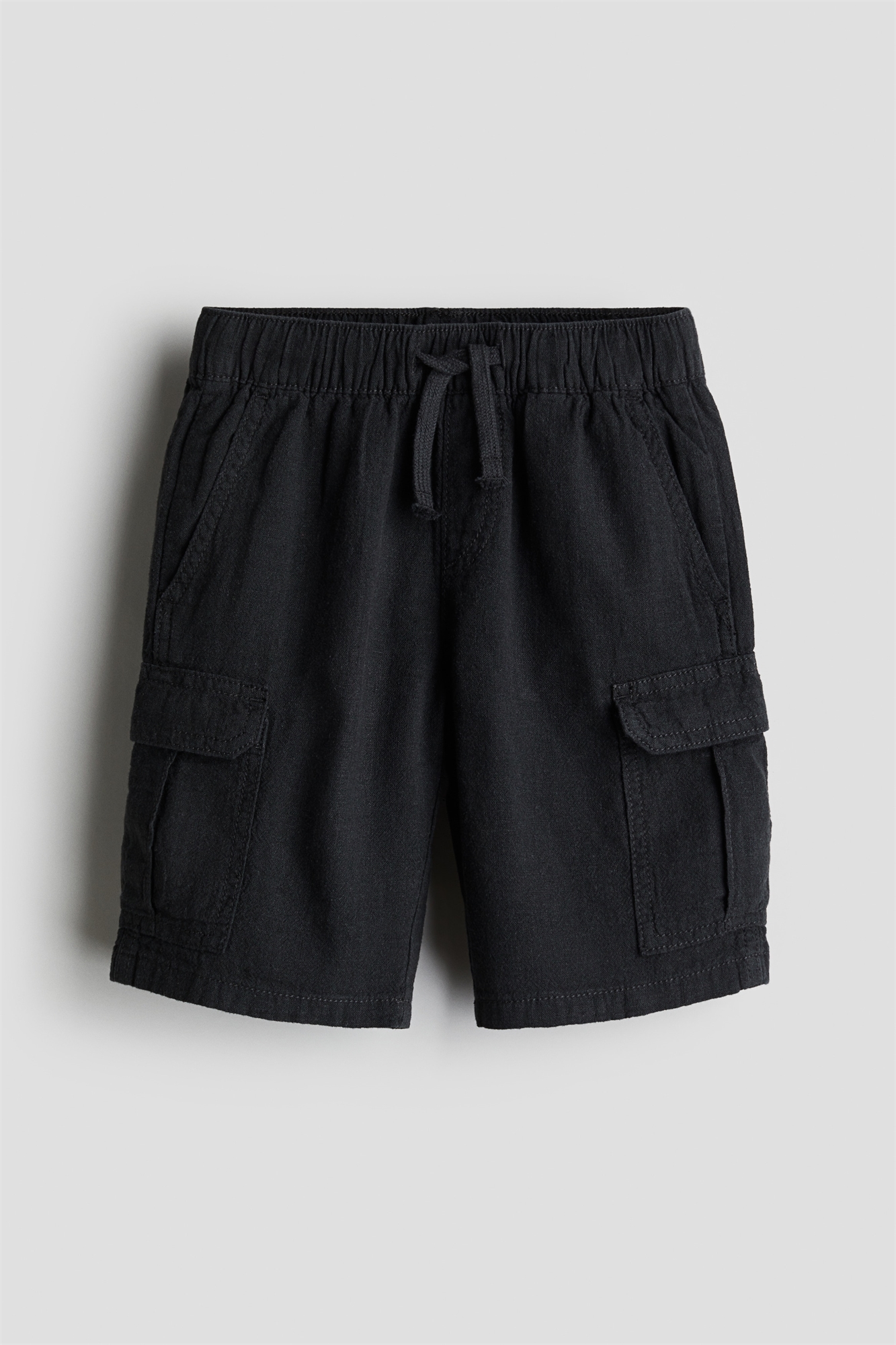 Шорты-карго из тканого материала из смеси льна и хлопка. Свободный крой, эластичный пояс с завязками, диагональные боковые карманы, декоративный карман с клапаном сзади и ножные карманы с клапаном.