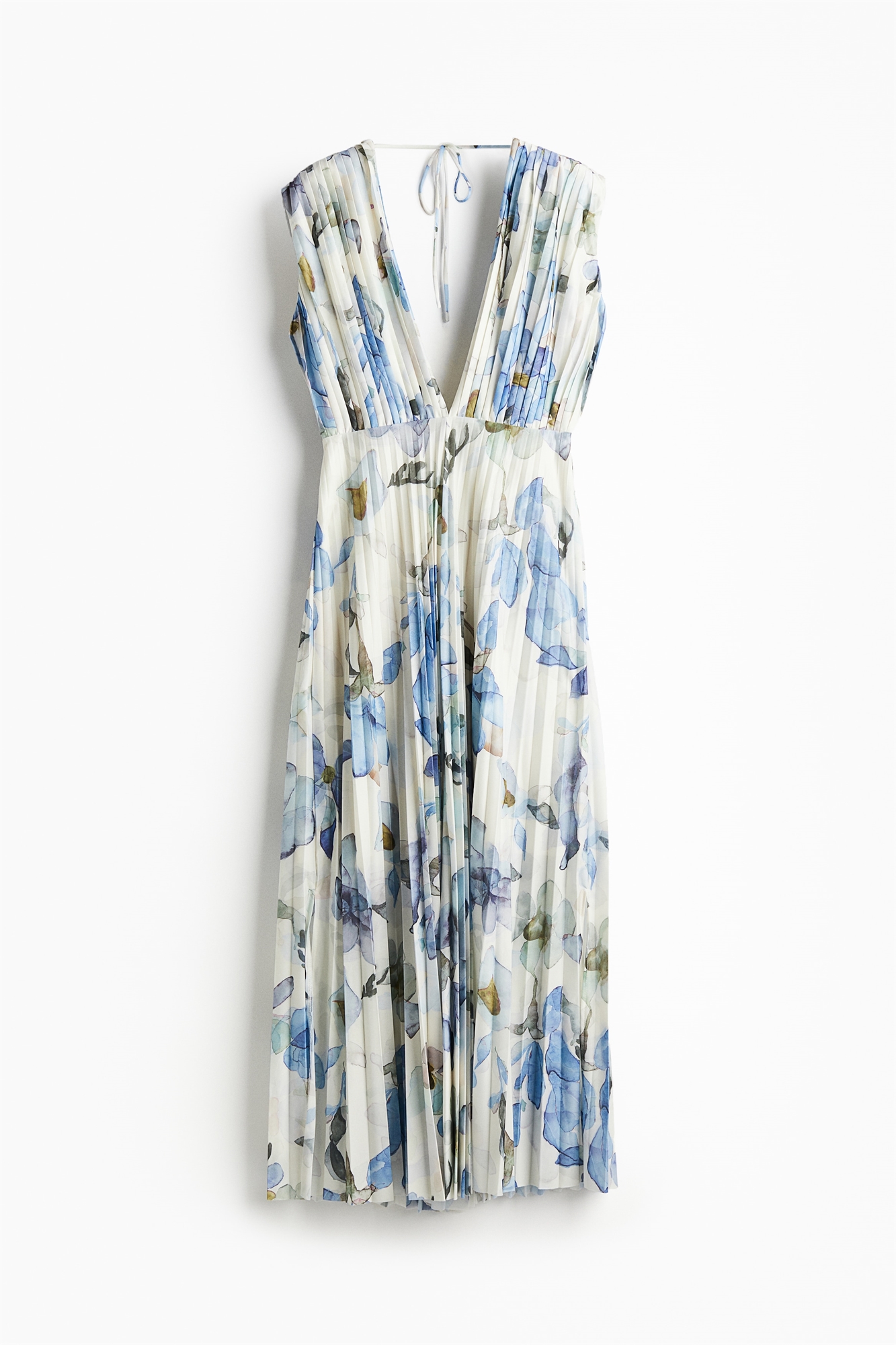 Платье длиной до щиколоток и без рукавов из плиссированного джерси. Глубокий V-образный вырез спереди и сзади, глубокие проймы, шов на талии и высокий разрез на подоле с каждой стороны. Подкладка из джерси.