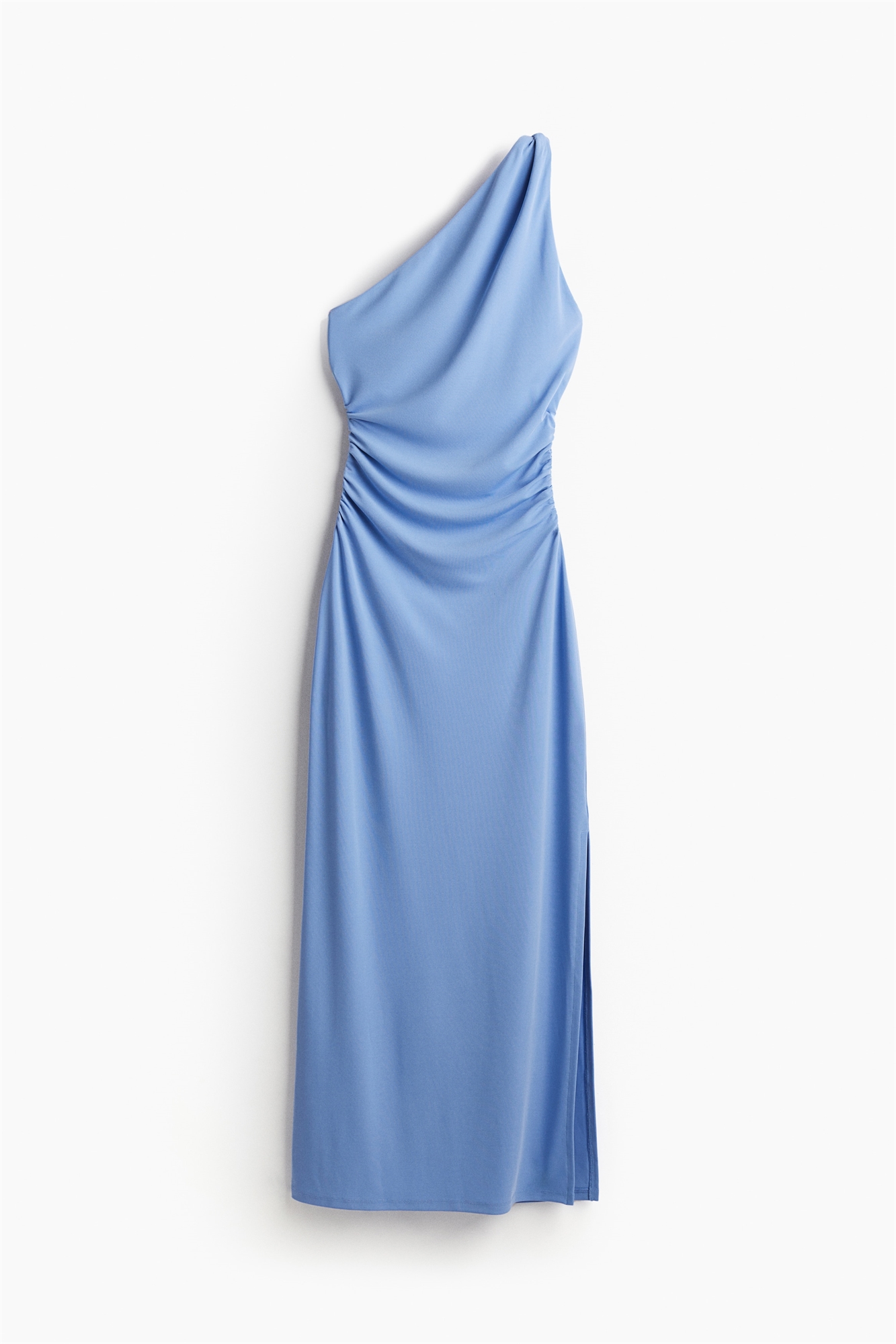 Приталенное платье на одно плечо из джерси-стрейч длиной до колен с асимметричным вырезом и одной свернутой бретелью. Сборки по бокам создают эффект легкой драпировки и придают силуэту стройность. Подол прямого кроя с разрезом с одной стороны. Лиф на подкладке.