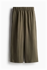 Свободные кюлоты из мягкой ткани с эластичной резинкой на талии, незаметными боковыми карманами и втачными карманами сзади.