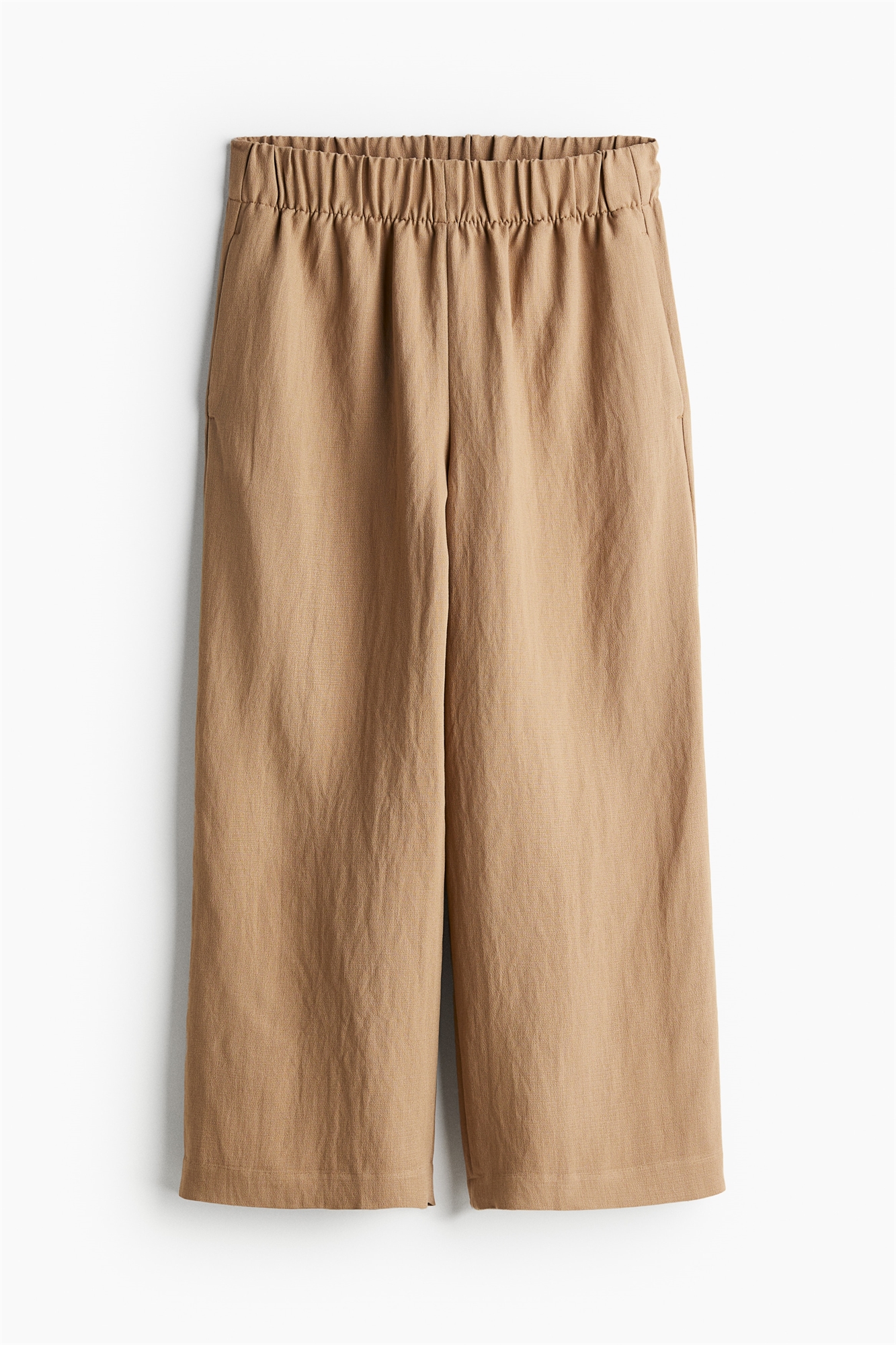 Свободные кюлоты из мягкой ткани с эластичной резинкой на талии, незаметными боковыми карманами и втачными карманами сзади.