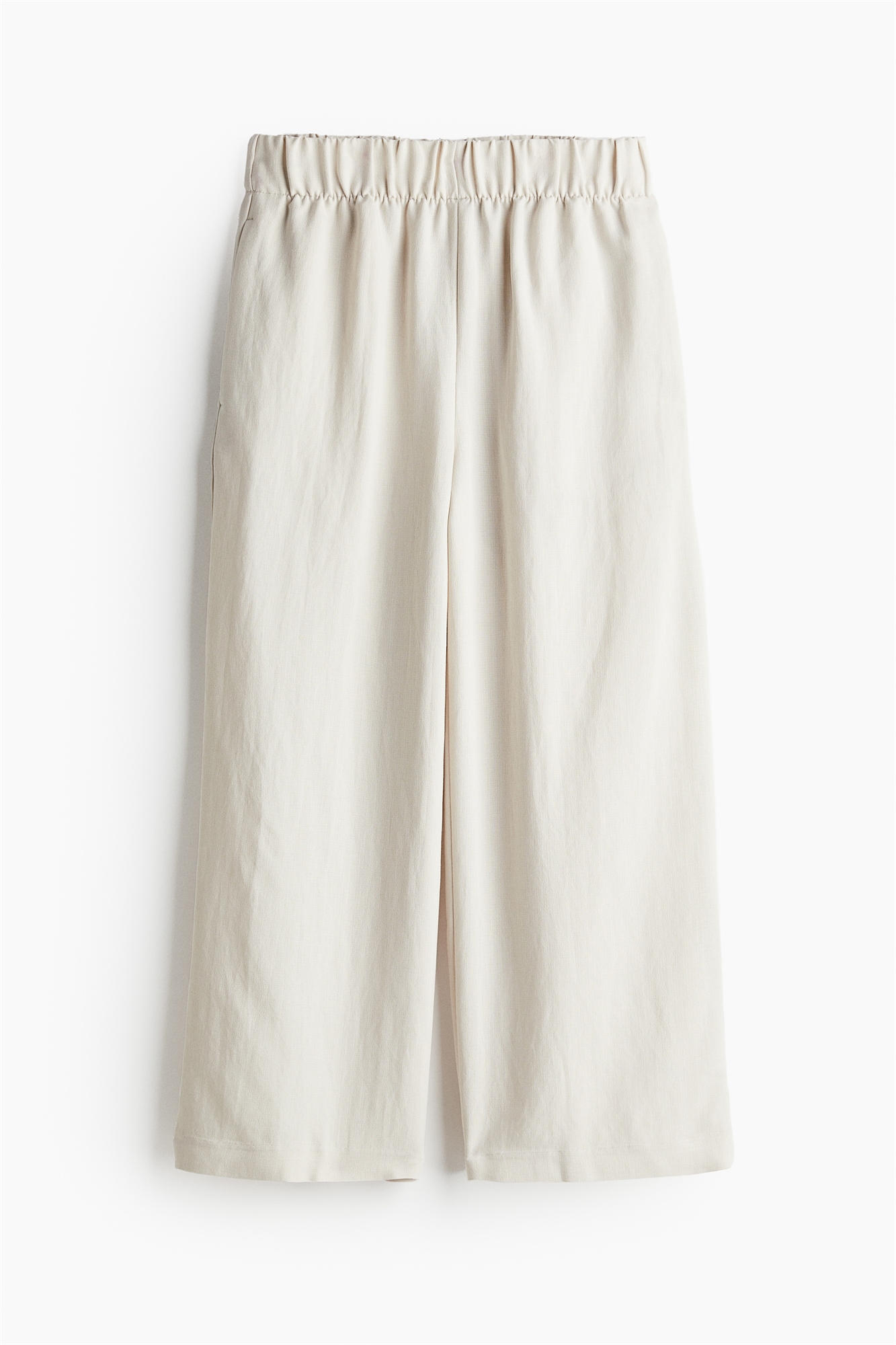 Свободные кюлоты из мягкой ткани с эластичной резинкой на талии, незаметными боковыми карманами и втачными карманами сзади.
