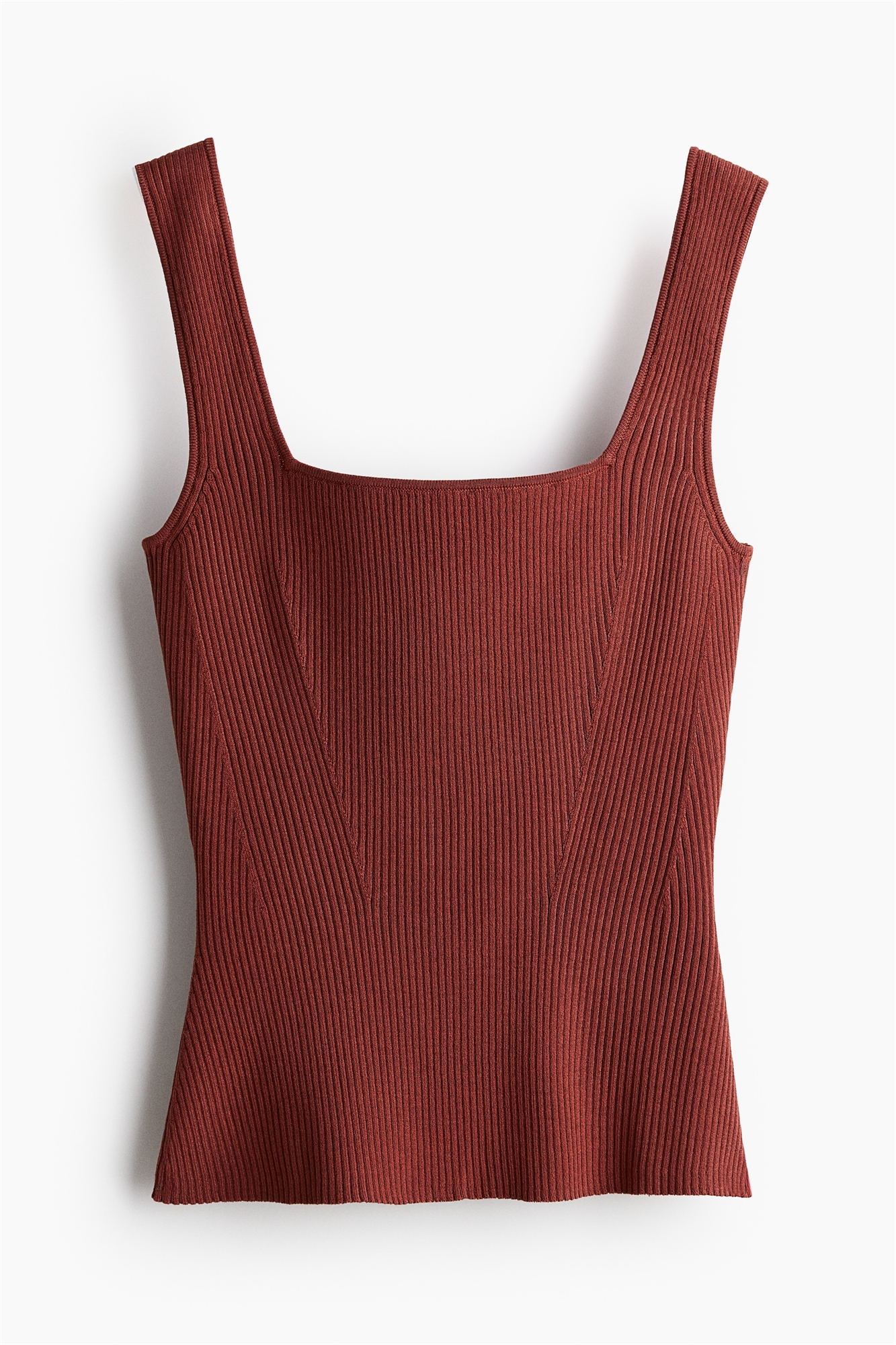Приталенный жилет из мягкого трикотажа в рубчик с квадратным вырезом и полностью отстроченными разрезами спереди.