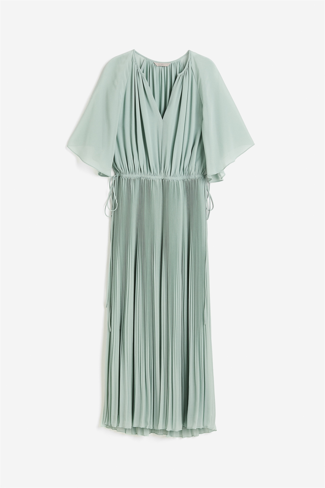 Платье длиной до колена из прозрачного шифона с плиссированной юбкой. Свободный крой с круглым вырезом, V-образной проймой спереди и рукавами-бабочками покроя реглан. Узкая резинка на талии и декоративные завязки-спагетти по бокам. Частично на подкладке.
