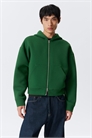 Толстовка с капюшоном на молнии, выполненная из мокрой ткани скуба с примесью переработанного полиэстера и вискозы, с добавлением переработанного эластана. Слегка опущенные плечи, ребристые манжеты и подол, а также прочная двусторонняя застежка-молния спереди.