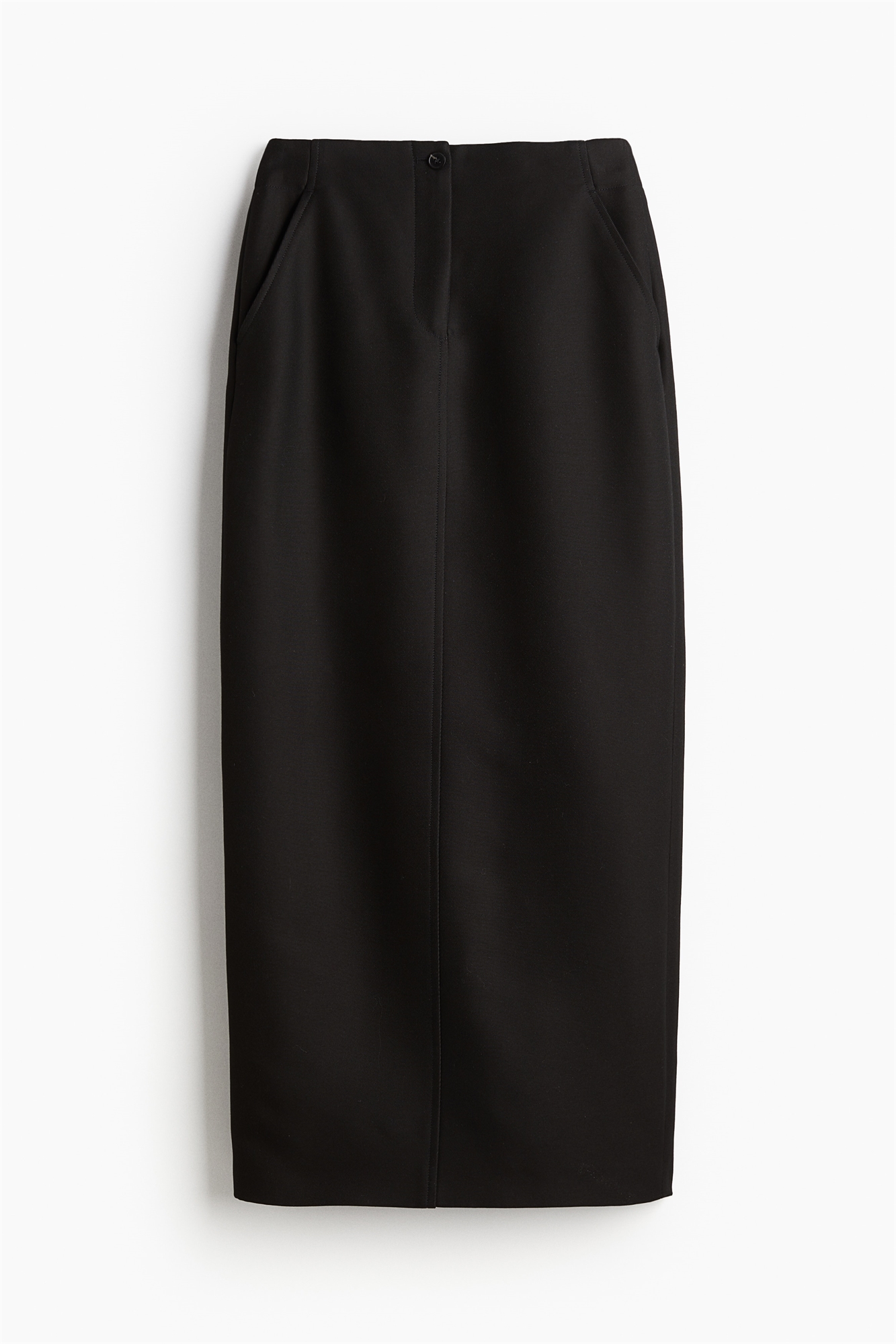Длинная юбка из тканого материала с высокой талией, застежкой на молнию и пуговицу, диагональными боковыми карманами и накладными задними карманами. Подол прямого покроя с разрезом сзади. На подкладке.