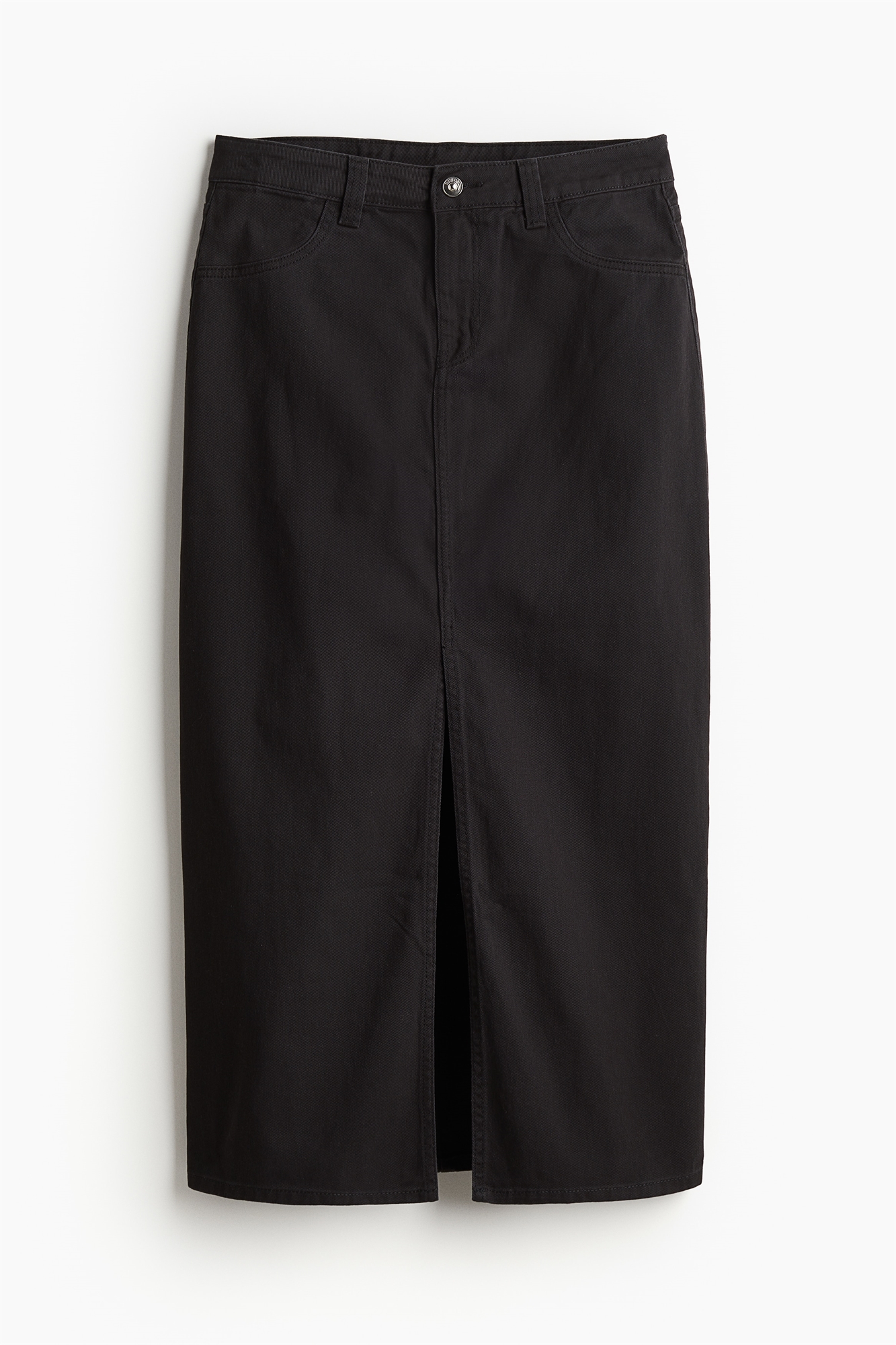 Юбка длиной до колена из хлопковой саржи с ширинкой на молнии и пуговице, фальшивыми передними и настоящими задними карманами. Подол прямого покроя с высоким разрезом спереди. Без подкладки.