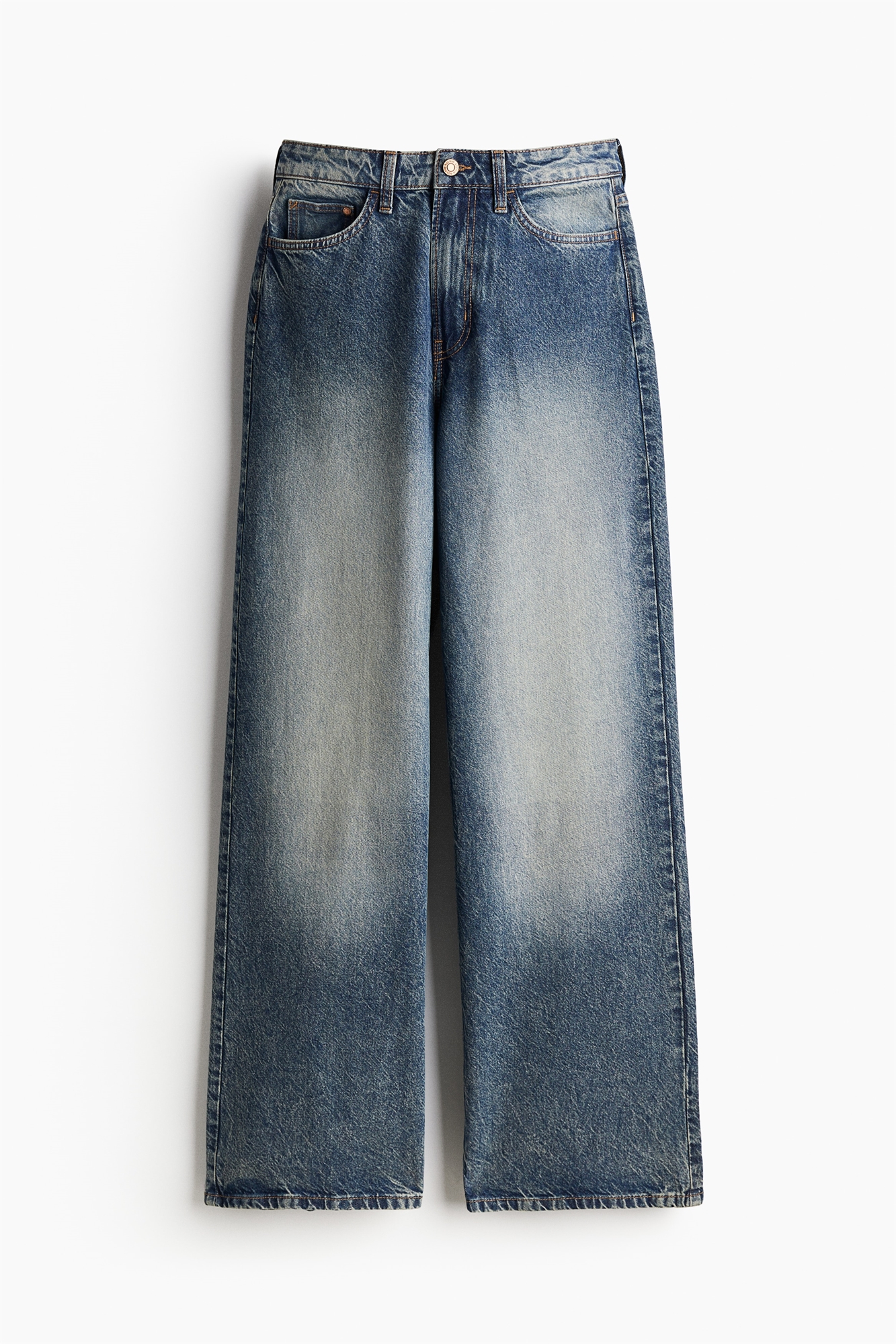 Джинсы с 5 карманами из жесткого хлопкового денима, который сначала кажется упругим, но затем смягчается и ослабевает при носке. Широкие штанины с обычной посадкой от талии до бедер и широким кроем от бедра до подола. Завышенная талия с ширинкой на молнии и пуговице. Регулярная длина, рассчитанная на то, чтобы доходить до верхней части стопы с минимальной или нулевой стопой. Джинсы с широкими штанинами - незаменимая вещь в гардеробе.