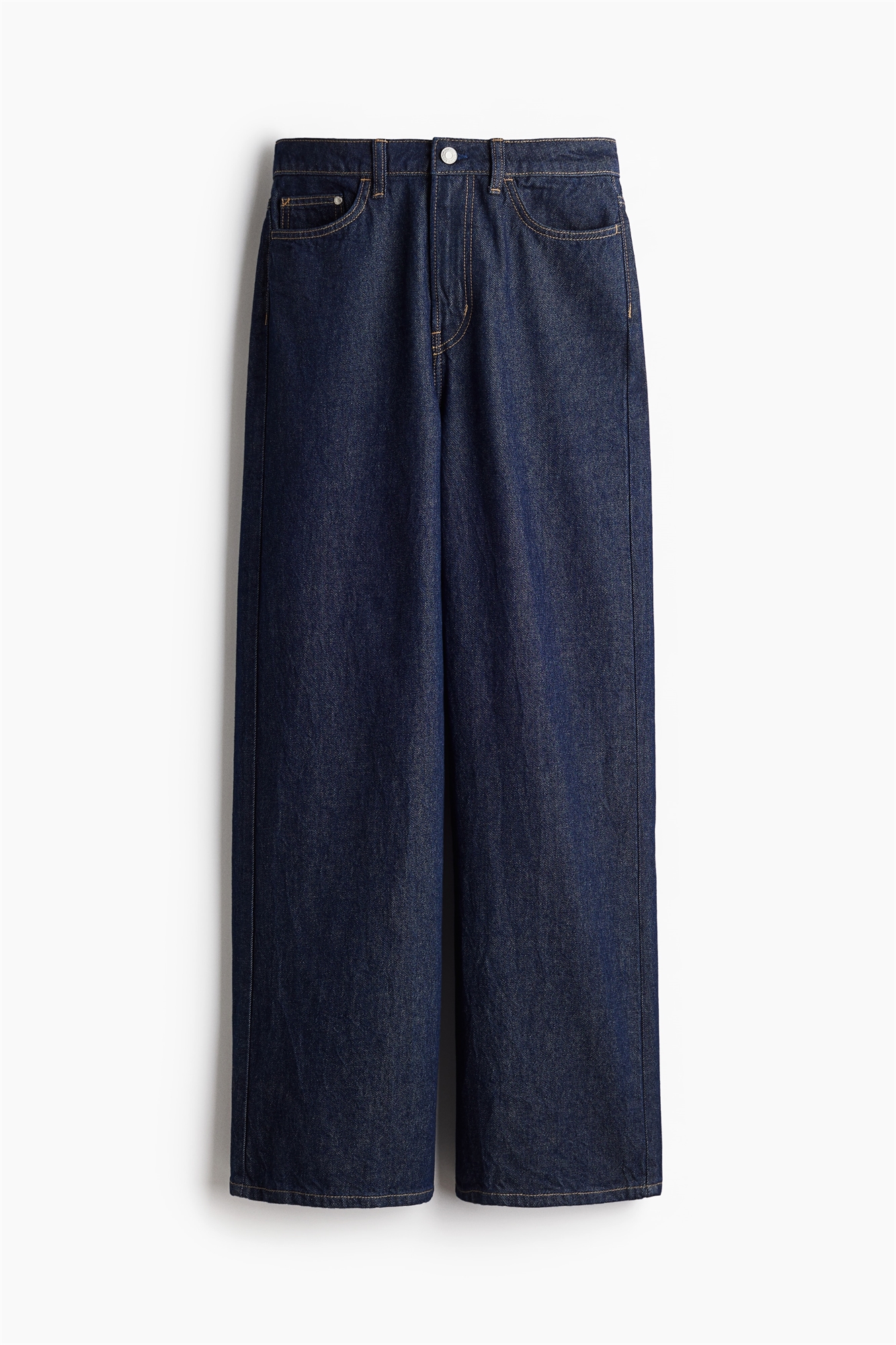 Джинсы с 5 карманами из жесткого хлопкового денима, который сначала кажется упругим, но затем смягчается и ослабевает при носке. Широкие штанины с обычной посадкой от талии до бедер и широким кроем от бедра до подола. Высокая талия с ширинкой на молнии и пуговице. Регулярная длина, рассчитанная на то, чтобы доходить до верхней части стопы с небольшим запасом или вообще без запаса.