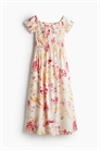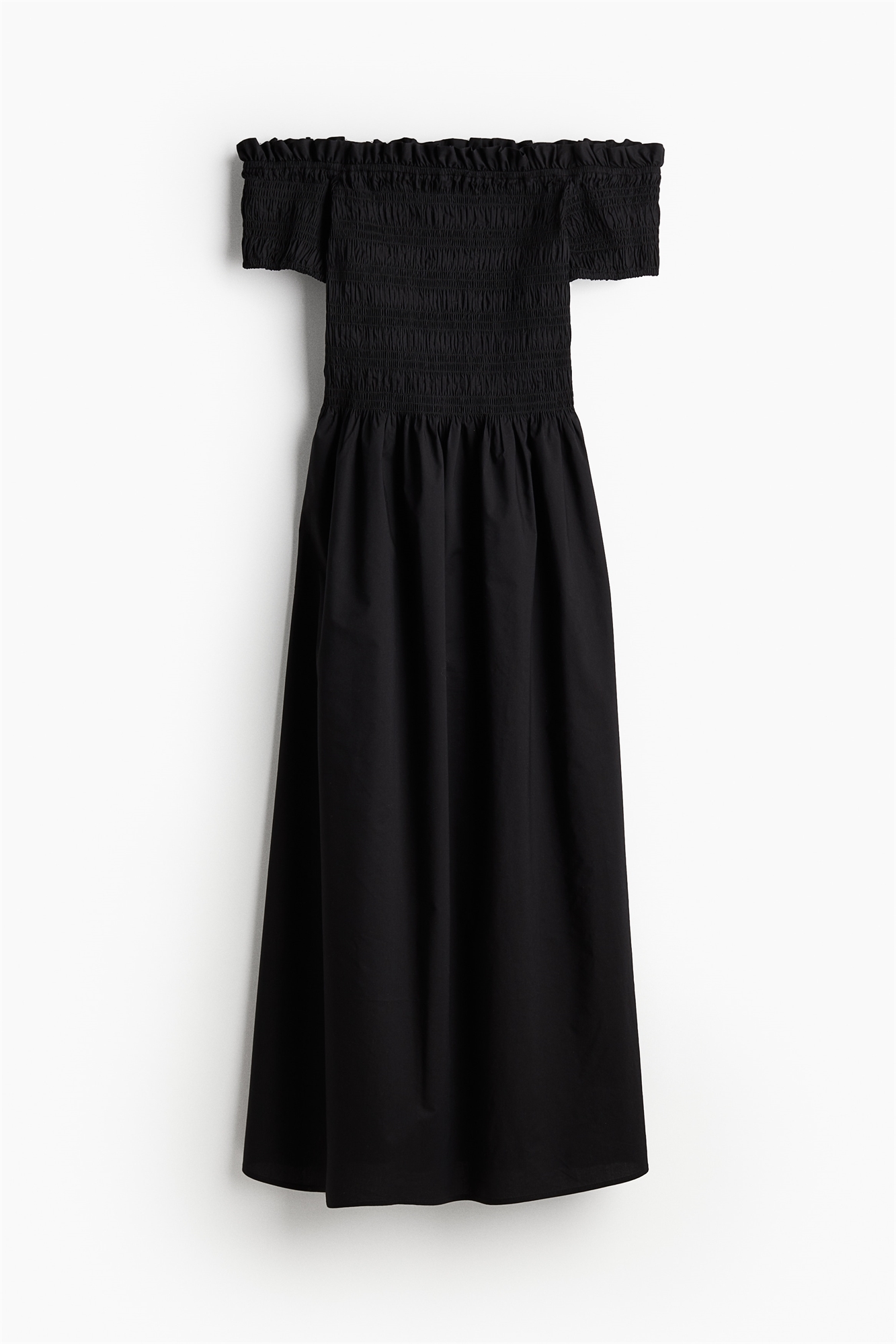 Длинное платье без плеч из тканого материала с лифом и короткими рукавами. Узкая оборка по верху, сборки на талии и расклешенная юбка. Без подкладки.