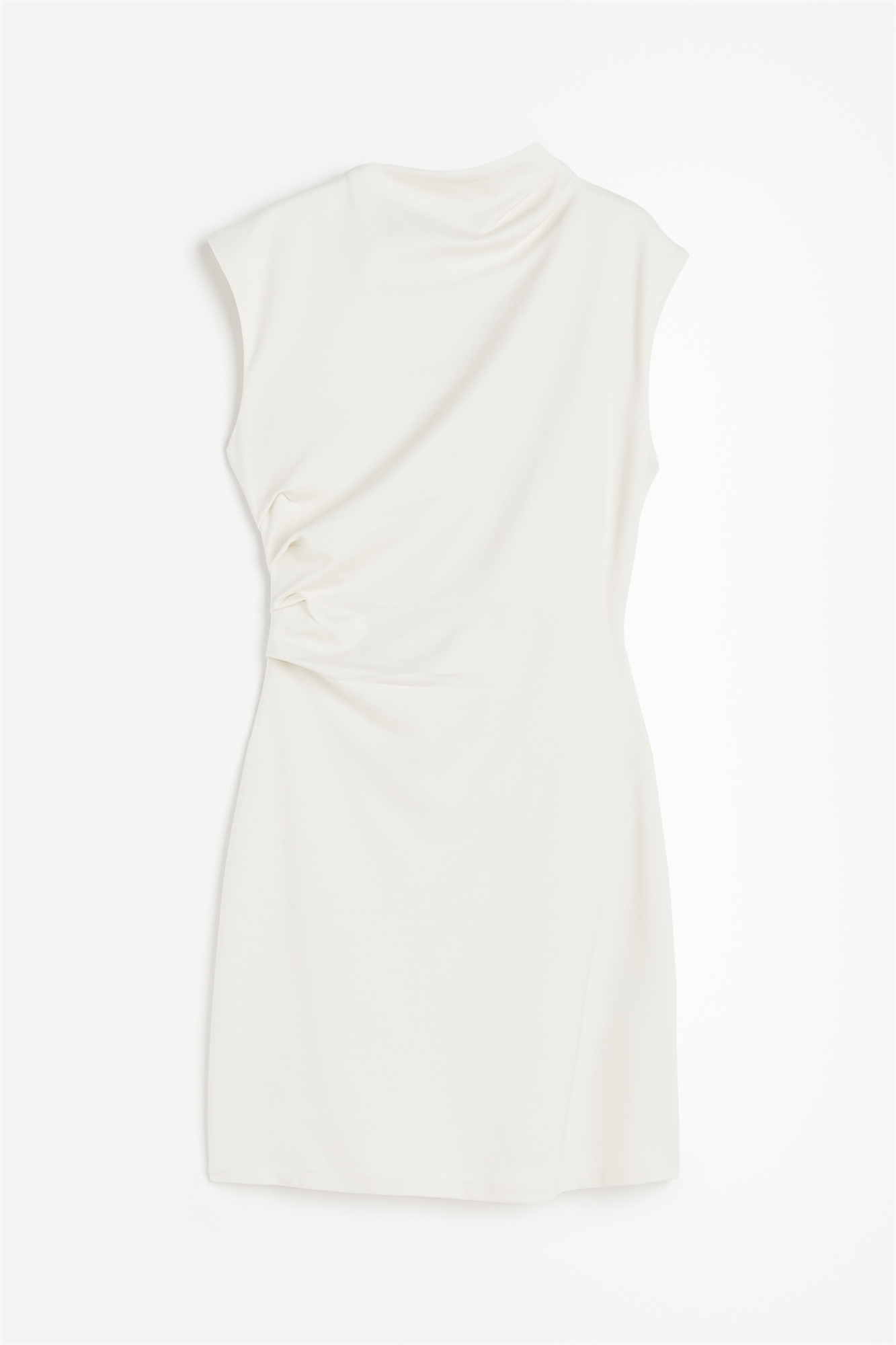 Короткое платье без рукавов из плотного джерси с асимметричным вырезом и складками на одном плече и по бокам талии для придания силуэту мягкой драпировки.