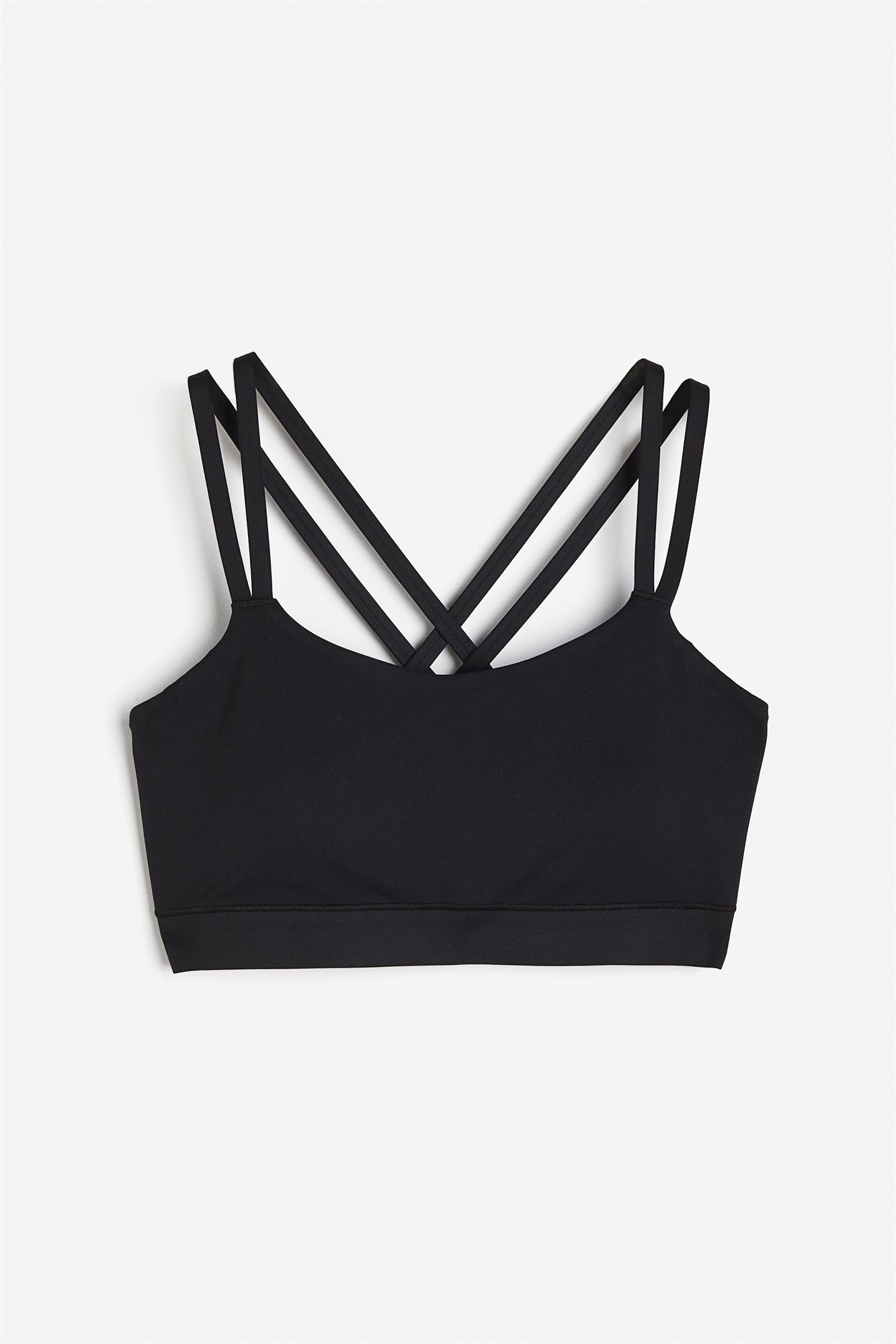 Спортивный бюстгальтер из функциональной ткани DryMove™, которая помогает отводить влагу от кожи, и SoftMove™, супермягкой, функциональной ткани, которая отличается легкостью и обеспечивает дополнительную свободу движений. Узкие двойные бретели, перекрещивающиеся сзади, и чашечки на подкладке со съемными вкладышами для регулируемой посадки и придания формы бюсту. Эластичная резинка по подолу. Без застежек. Легкая поддержка, подходящая для тренировок низкой интенсивности.