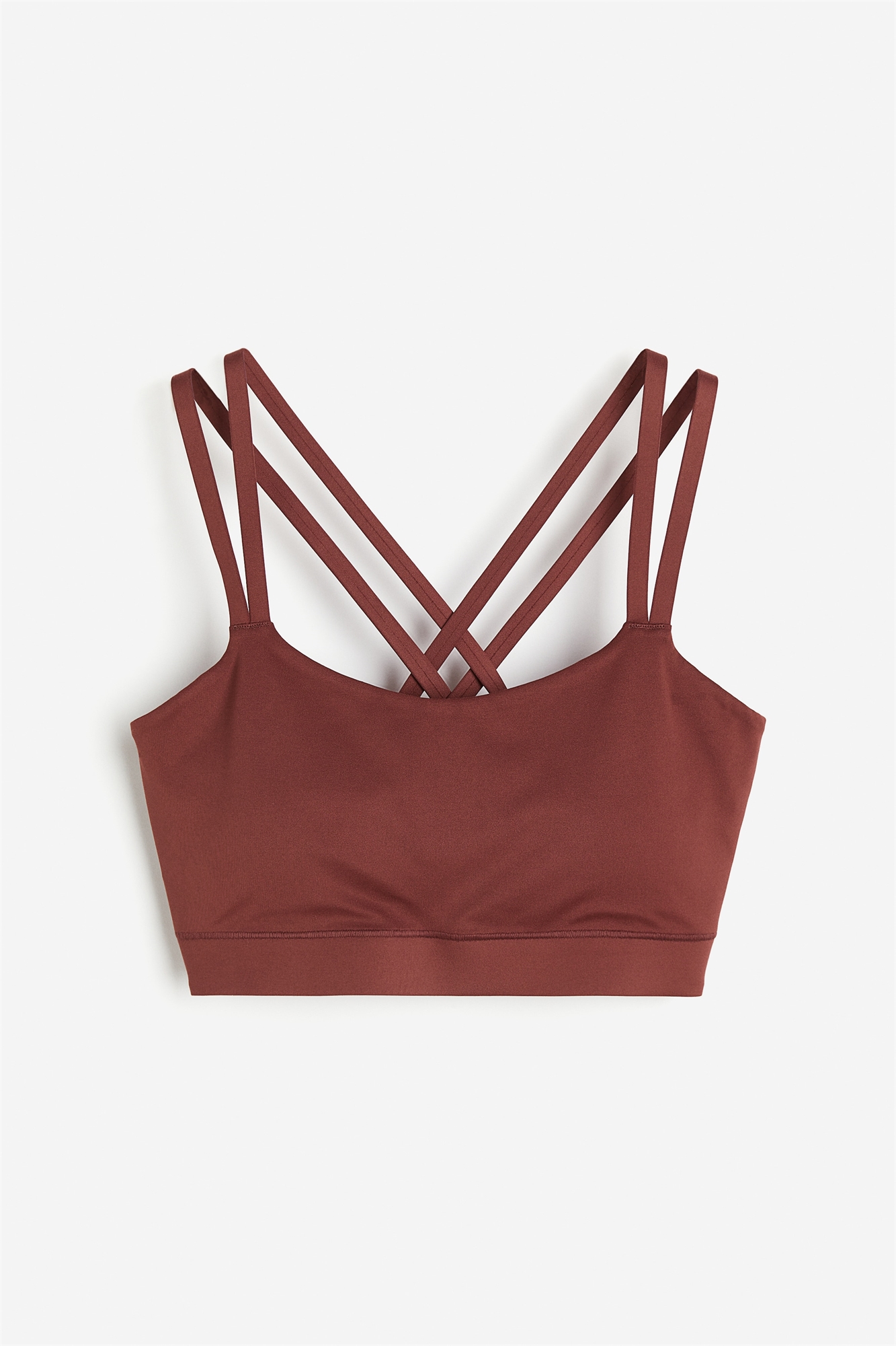 Спортивный бюстгальтер из функциональной ткани DryMove™, которая помогает отводить влагу от кожи, и SoftMove™, супермягкой, функциональной ткани, которая отличается легкостью и обеспечивает дополнительную свободу движений. Узкие двойные бретели, перекрещивающиеся сзади, и чашечки на подкладке со съемными вкладышами для регулируемой посадки и придания формы бюсту. Эластичная резинка по подолу. Без застежек. Легкая поддержка, подходящая для тренировок низкой интенсивности.