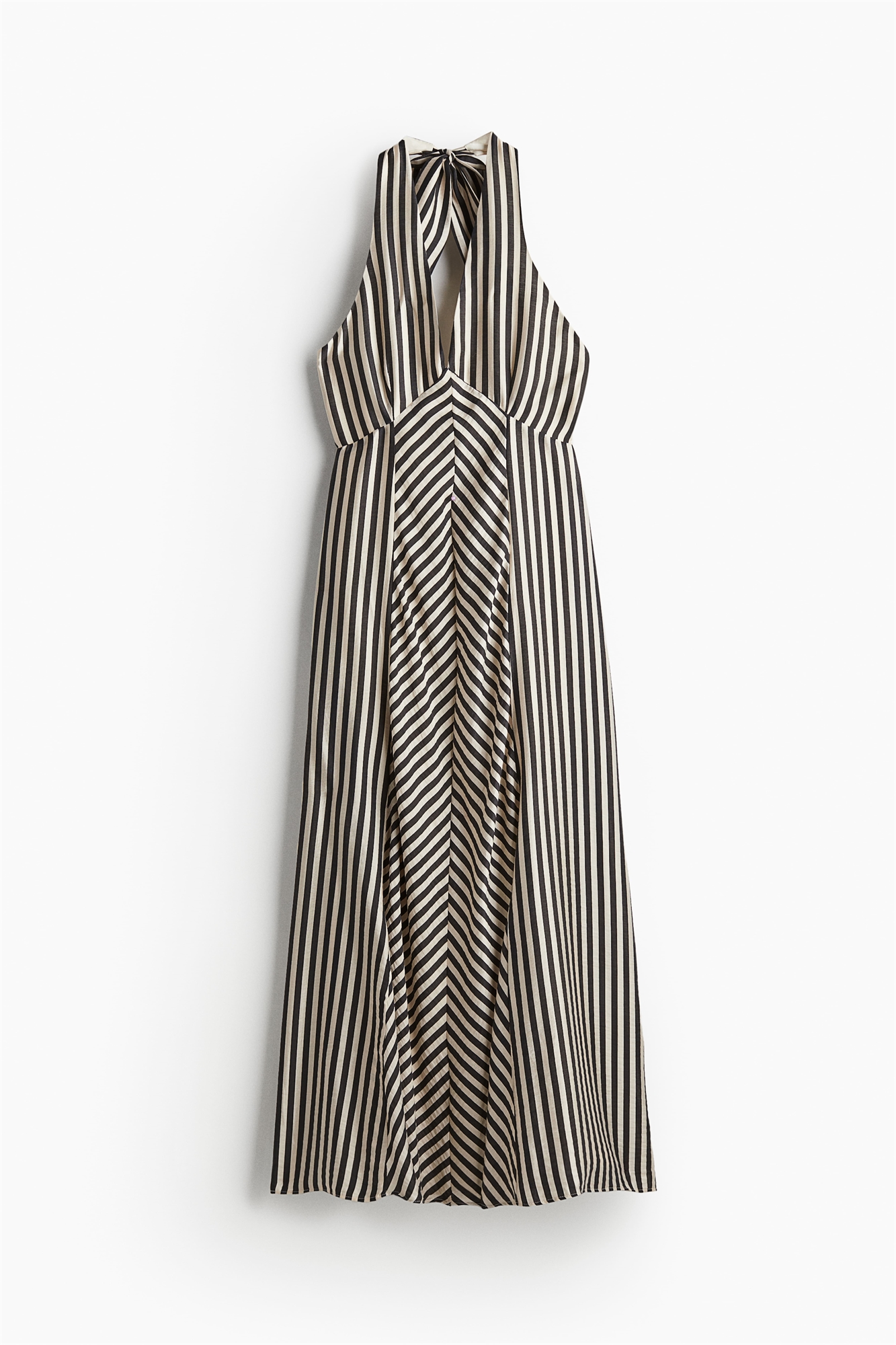 Длинное платье из тканого материала с глубоким V-образным вырезом, широкими завязками и открытой спиной. Расклешенная юбка и потайная застежка-молния сзади. На подкладке.