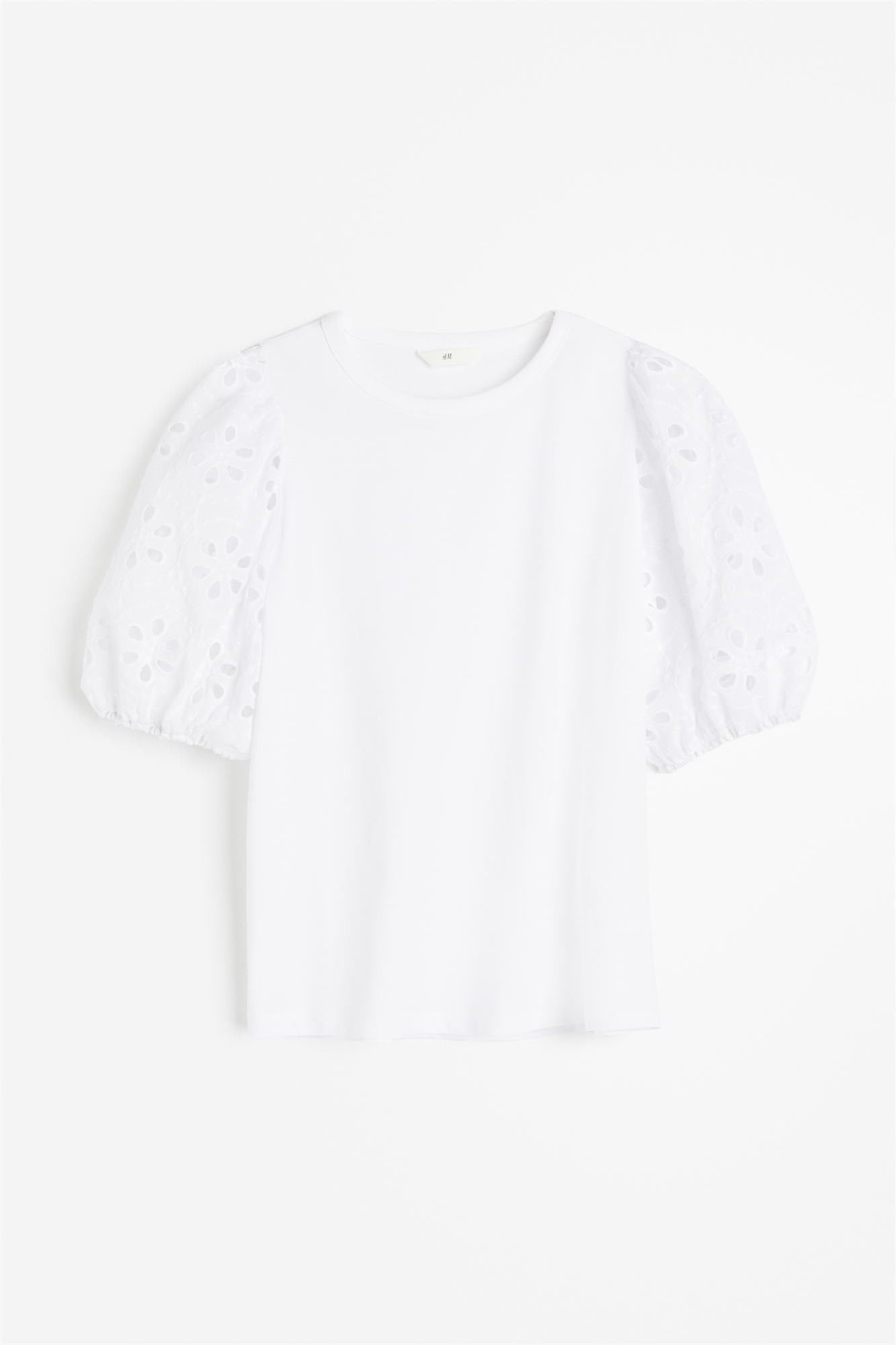 Топ из хлопкового джерси с круглым вырезом и короткими пышными рукавами в стиле бродери-англаз с узкими эластичными манжетами.