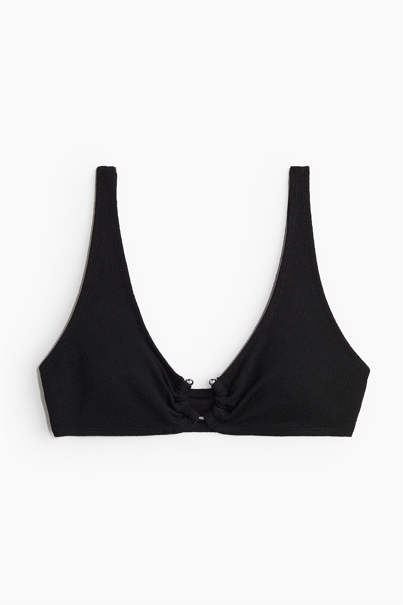 Бикини на подкладке, без проводов, с декоративным кольцом в центре бюста. Широкие бретели и чашечки со съемными вставками, придающими форму бюсту и обеспечивающими хорошую поддержку. Без застежек.